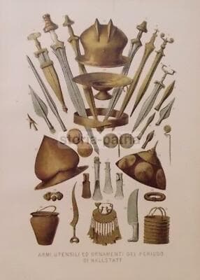 Militaria: Spade E Utensili Vari Antichi Stampa Cromolitografica Hallstatt
