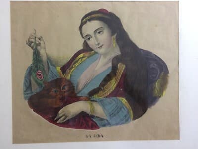 La Sera: Antica Allegoria Artistica. Donna Con Piuma E Gatto, Litografia Colorata Del XIX Secolo