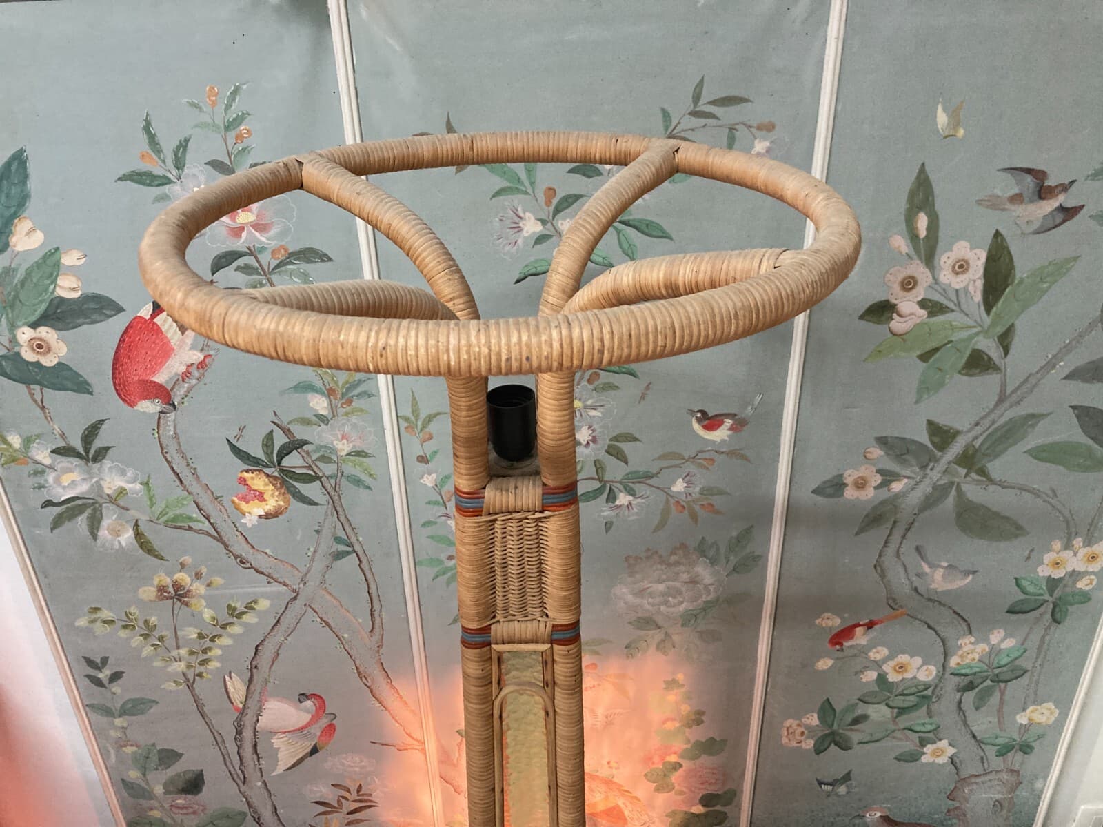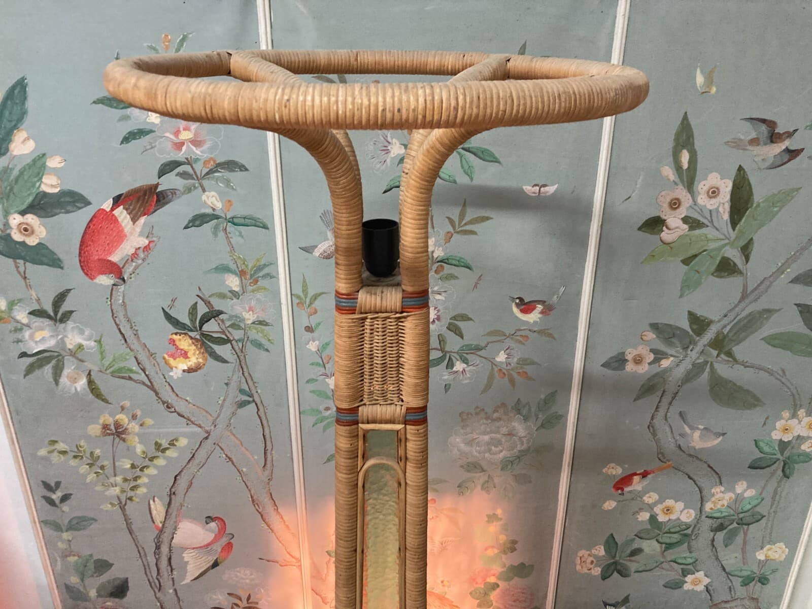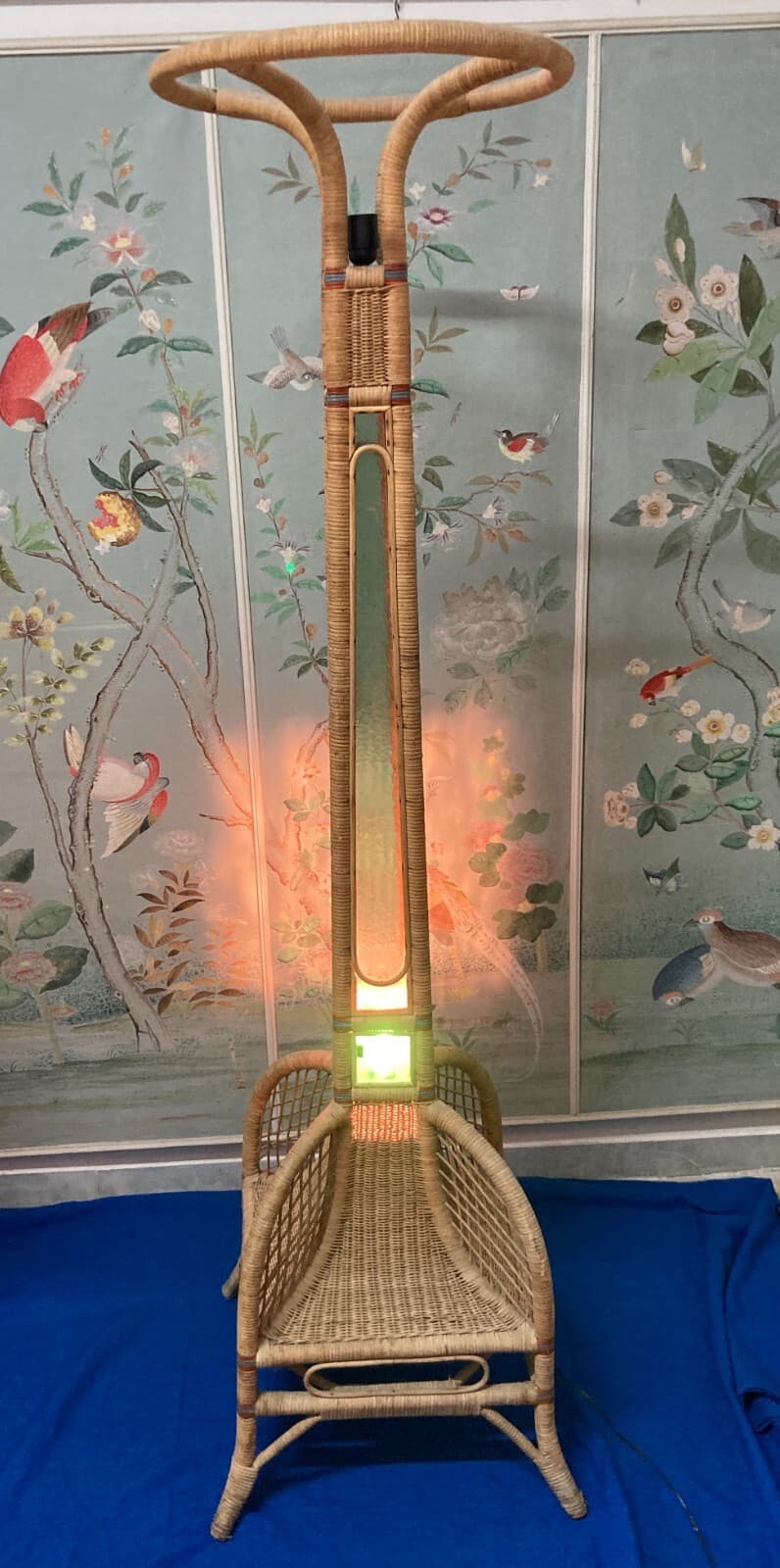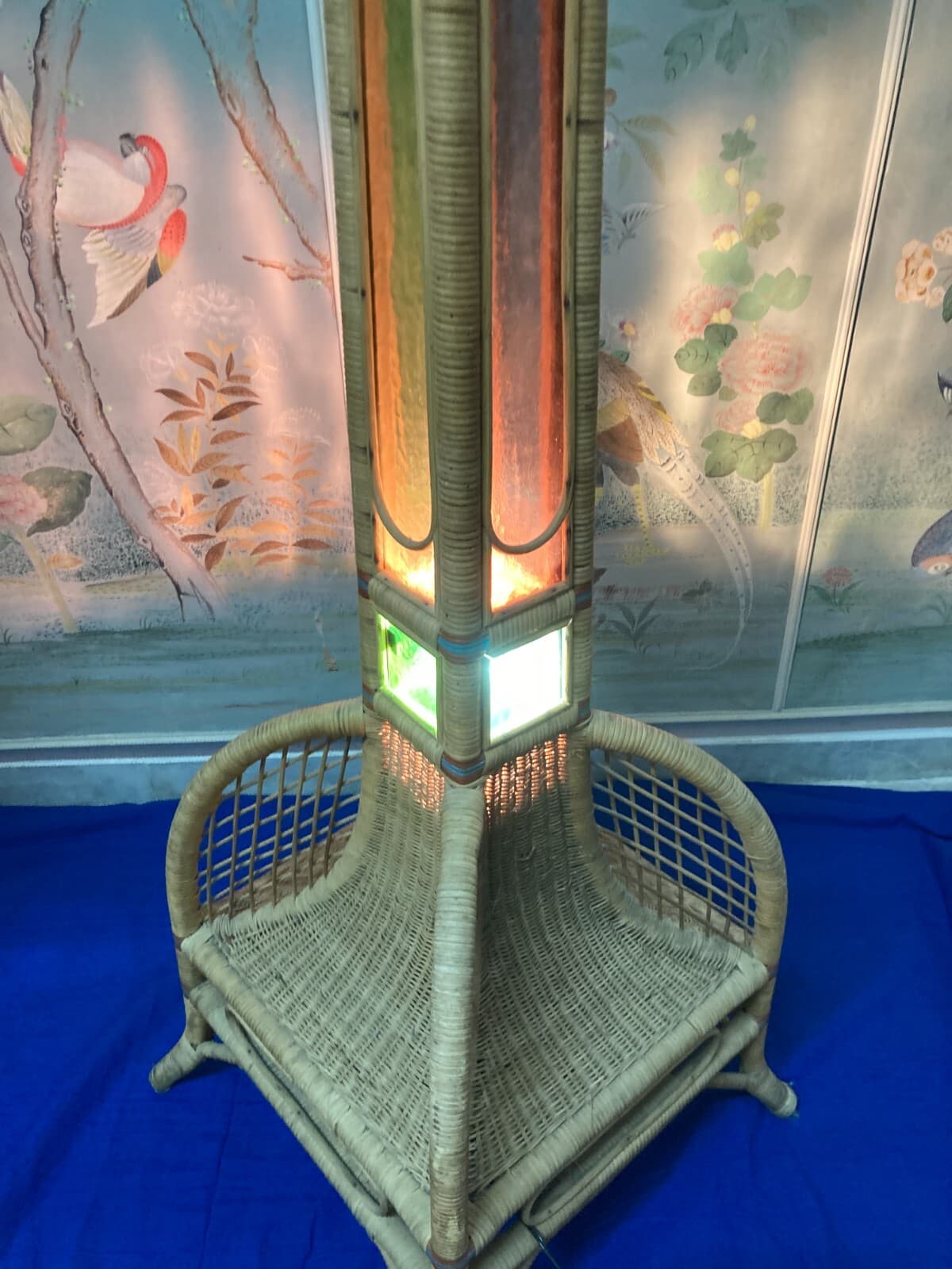 Modernariato, Design, Decorativa Lampada Piantana Con Vetri Colorati In Rattan E Vimini