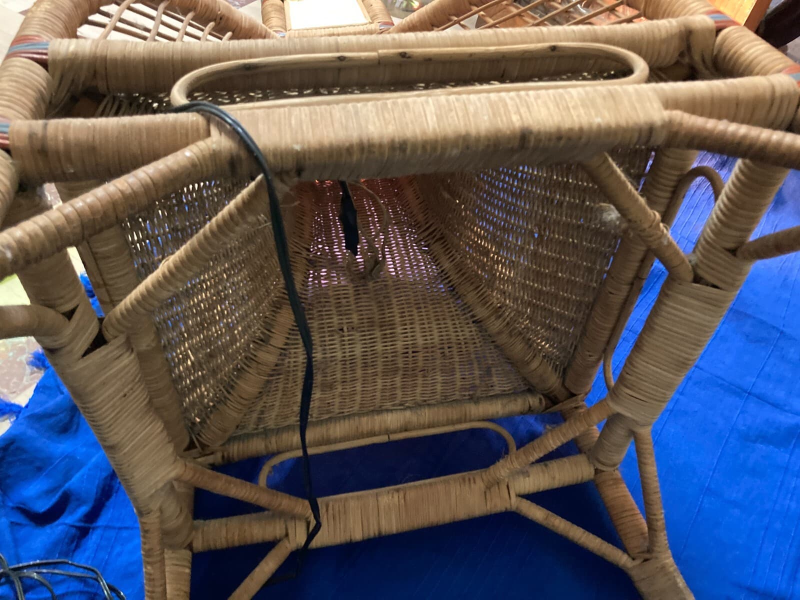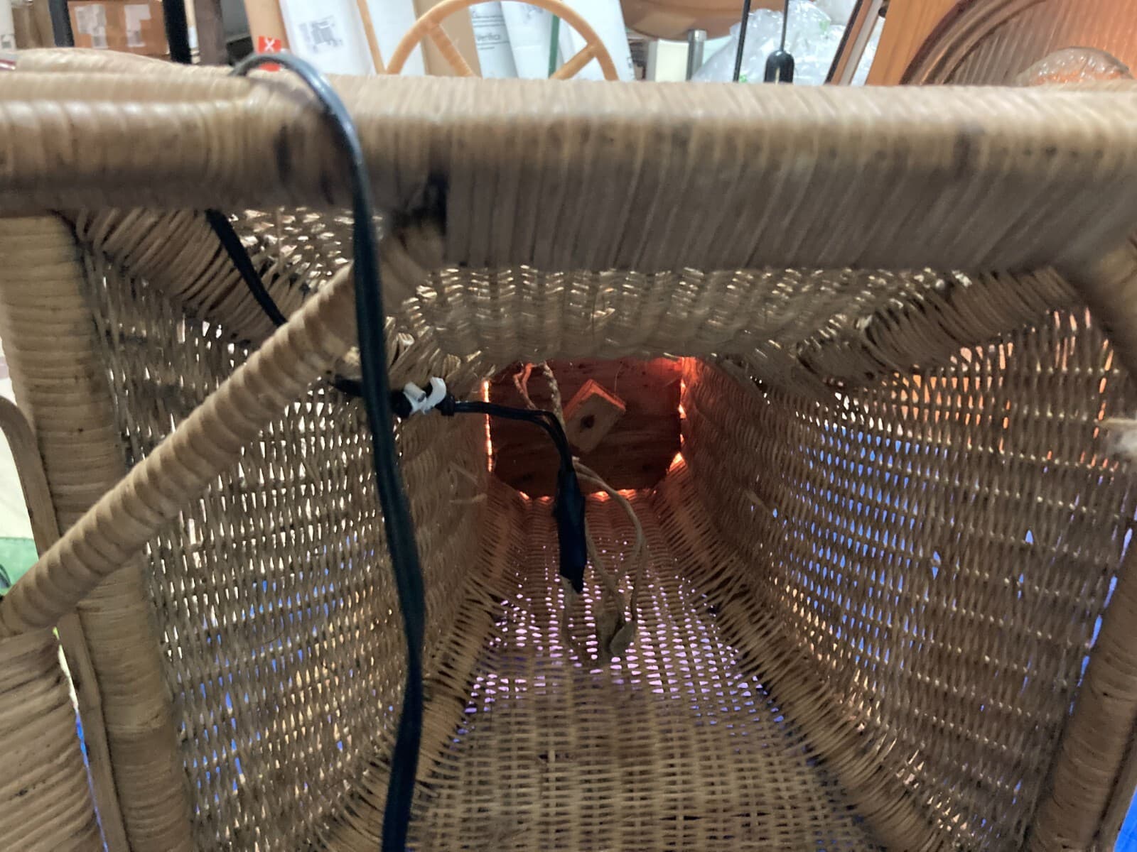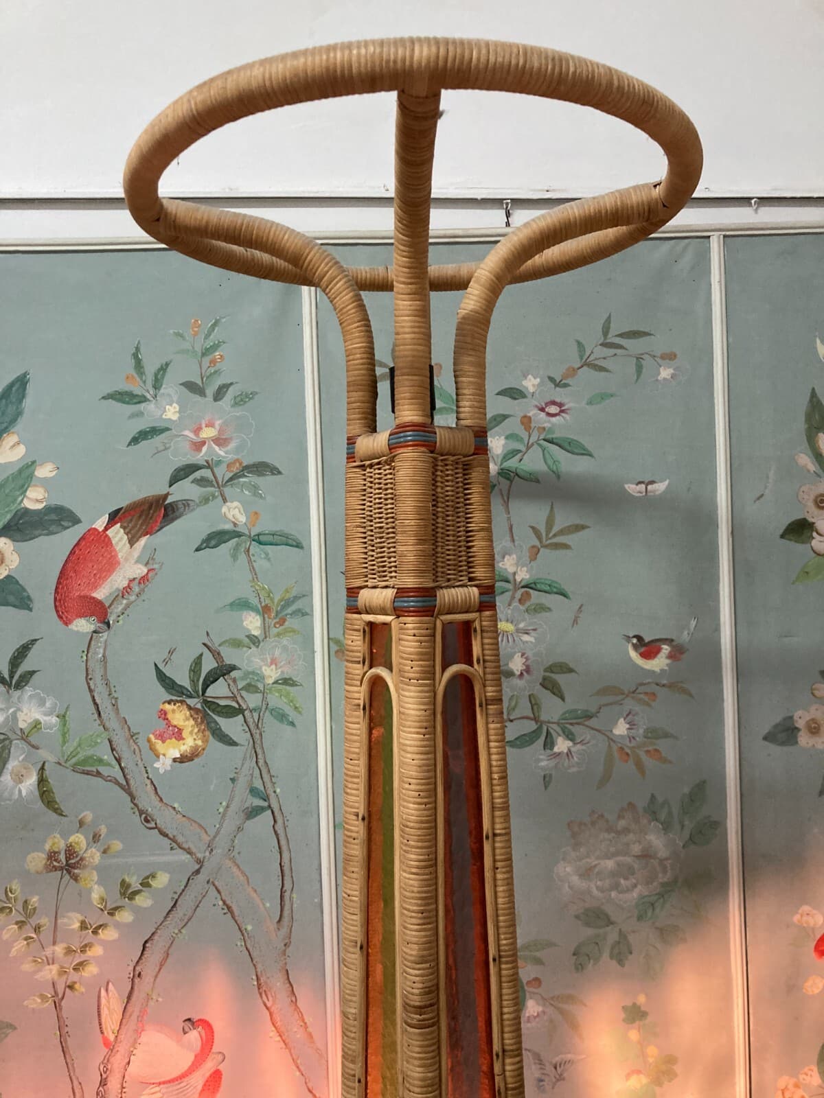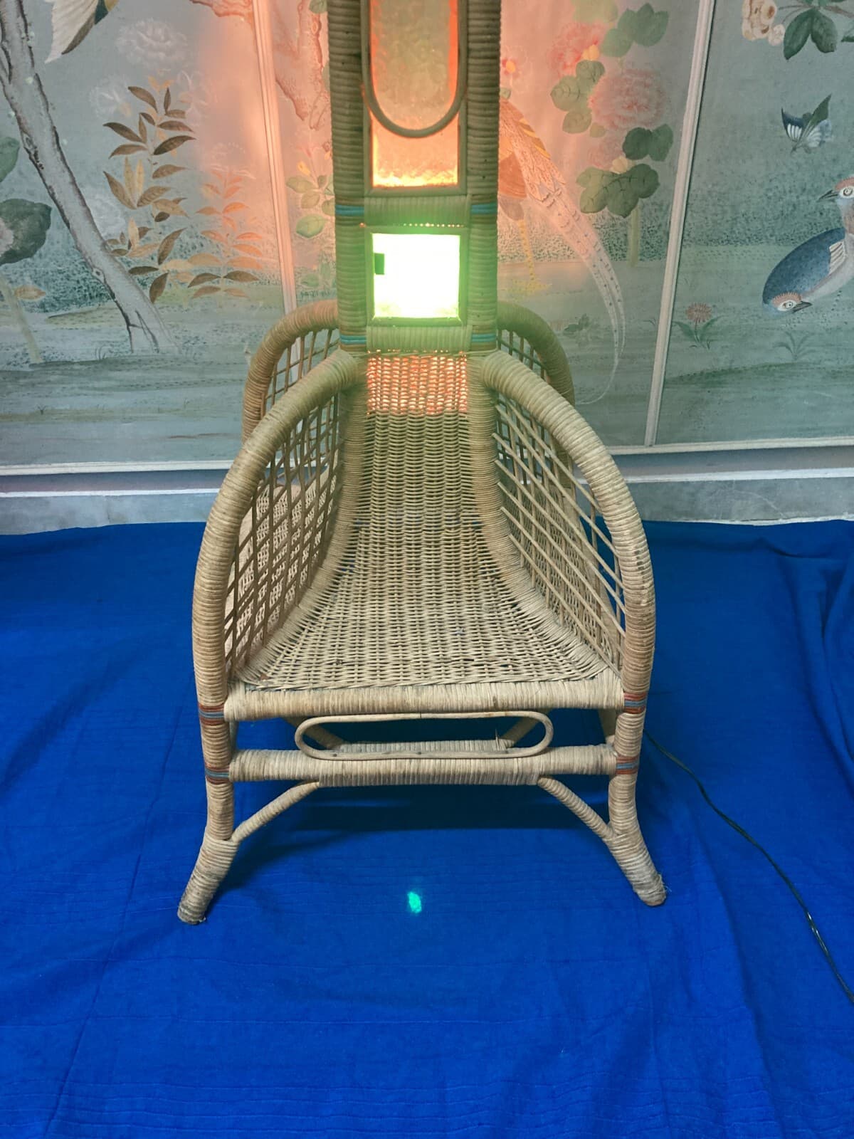 Modernariato, Design, Decorativa Lampada Piantana Con Vetri Colorati In Rattan E Vimini