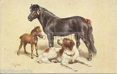 Arte Cinofilia: Veduta d'Insieme Con Un Cavallo, Un Cavallino E Un Cane Tuck