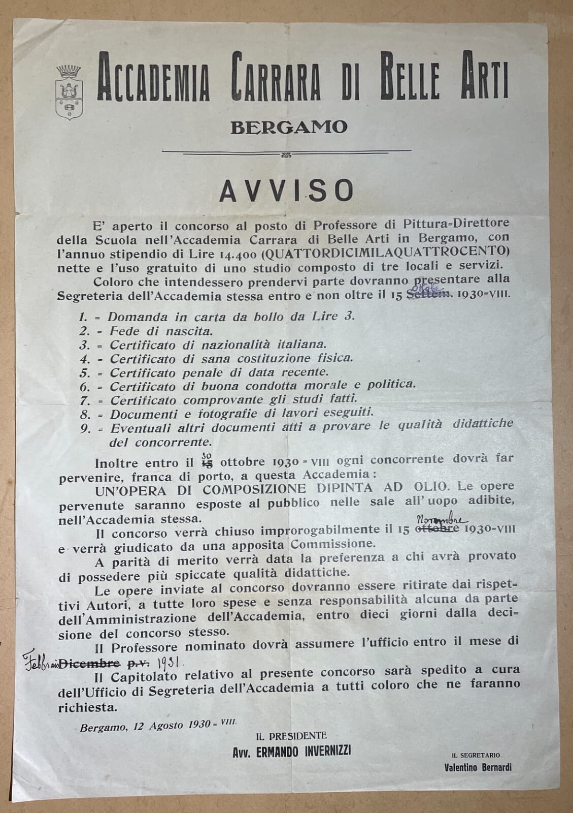 Arte. Bergamo, Accademia Carrara: Manifesto Pubblicitario Per Concorso Docente, 1930