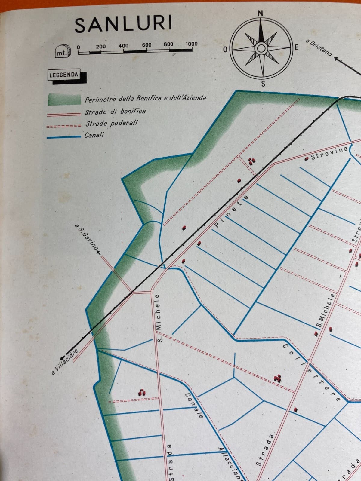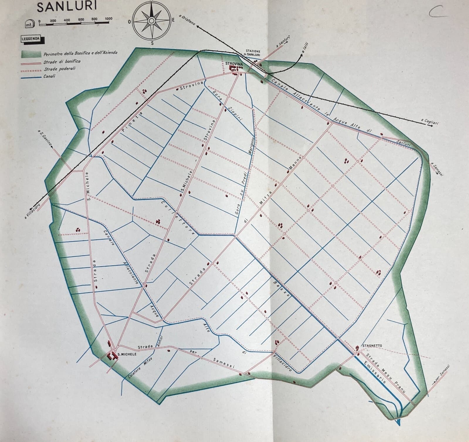 Idraulica, Bonifiche, Sardegna, Sanluri: Mappa Topografica Decorativa d'Epoca