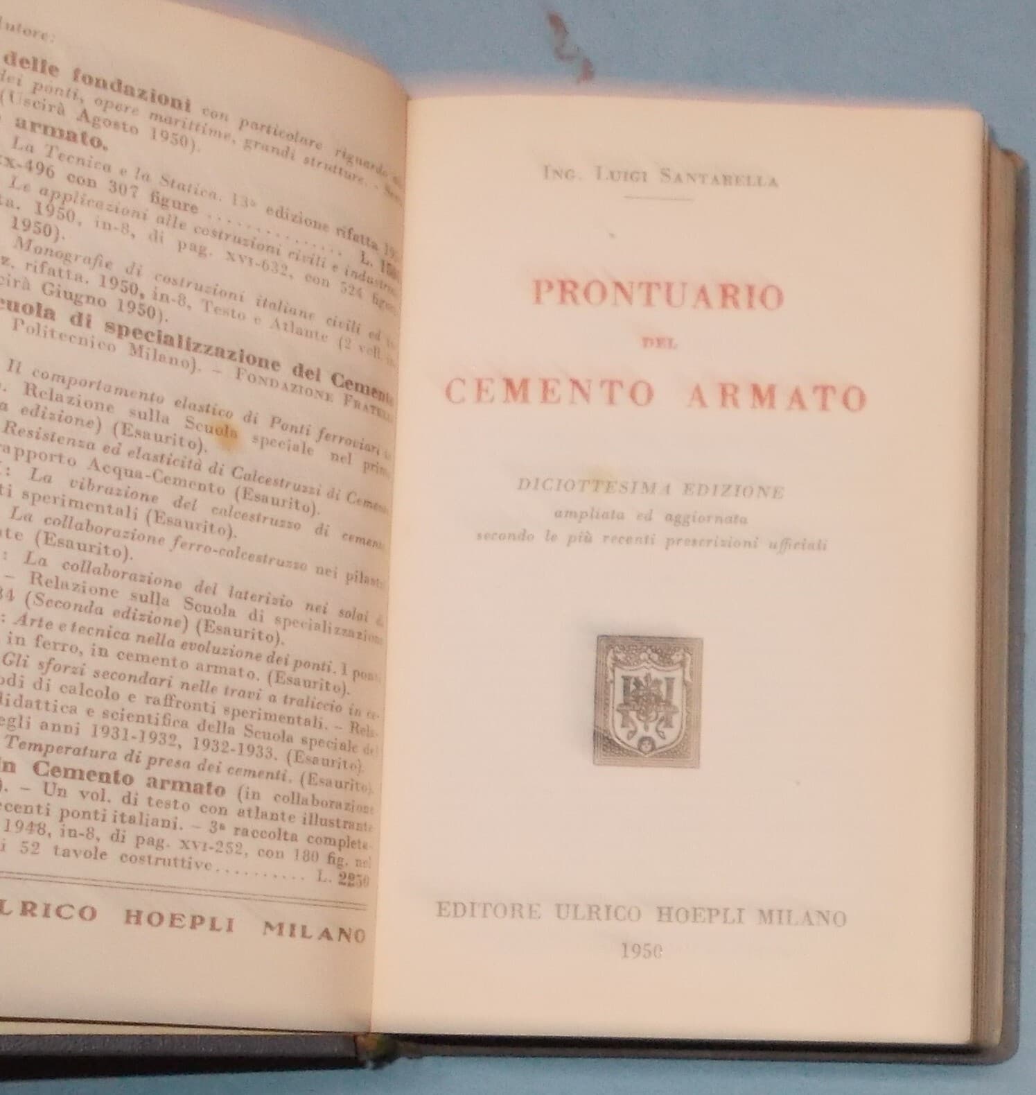 Edilizia, Cemento Armato, Pilastri, Travi, Telai, Archi, Santarella, Corato, Hoepli, 1950