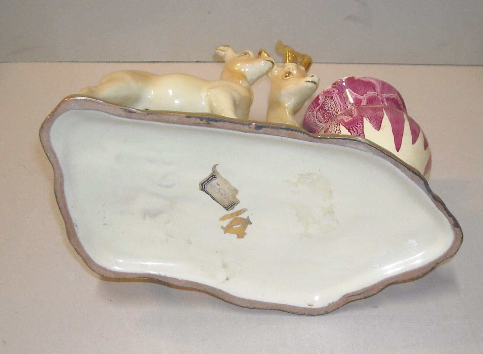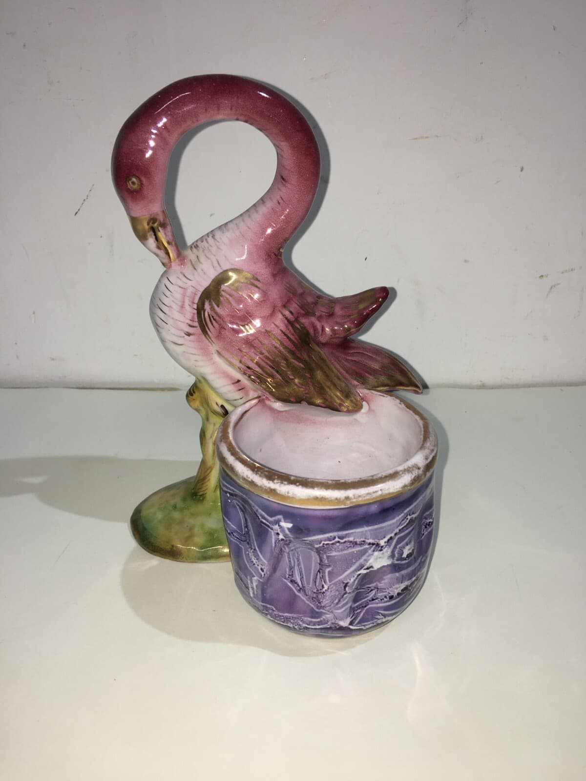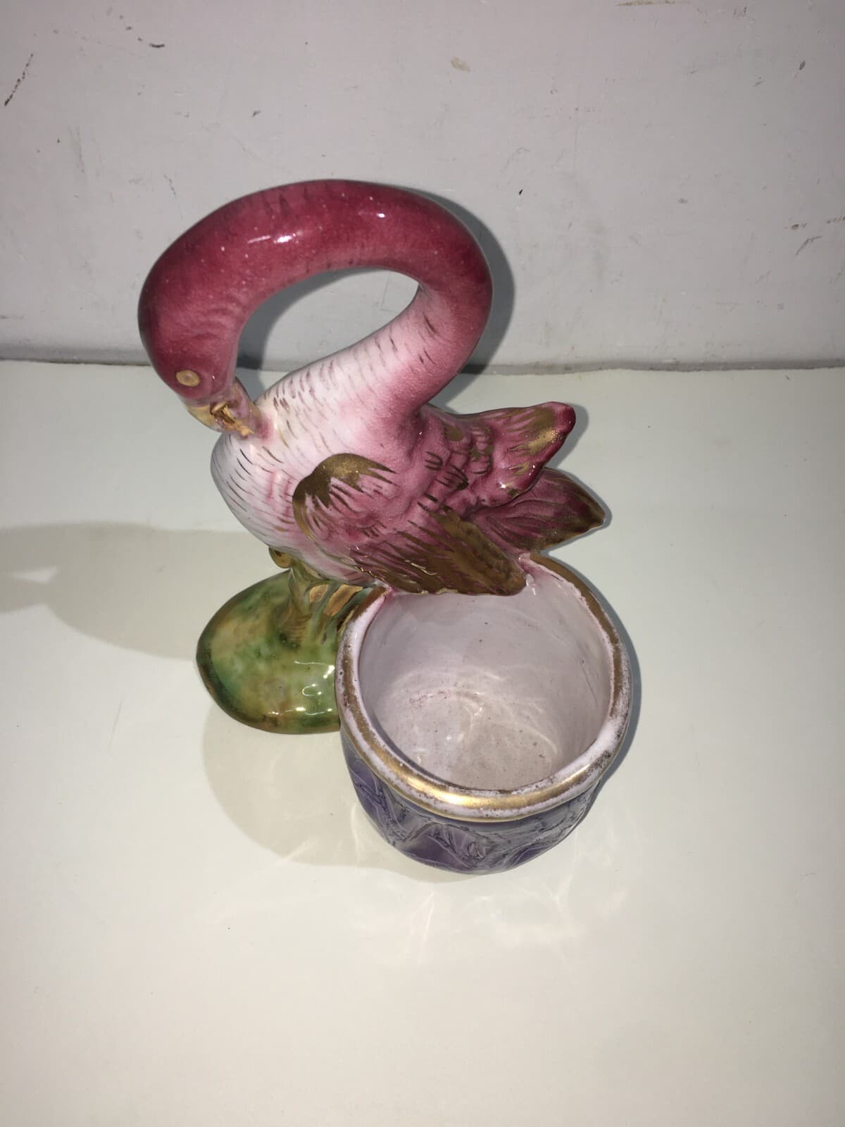 Soprammobile In Ceramica Con Figure Di Paperi E Cestino Svuotatasche