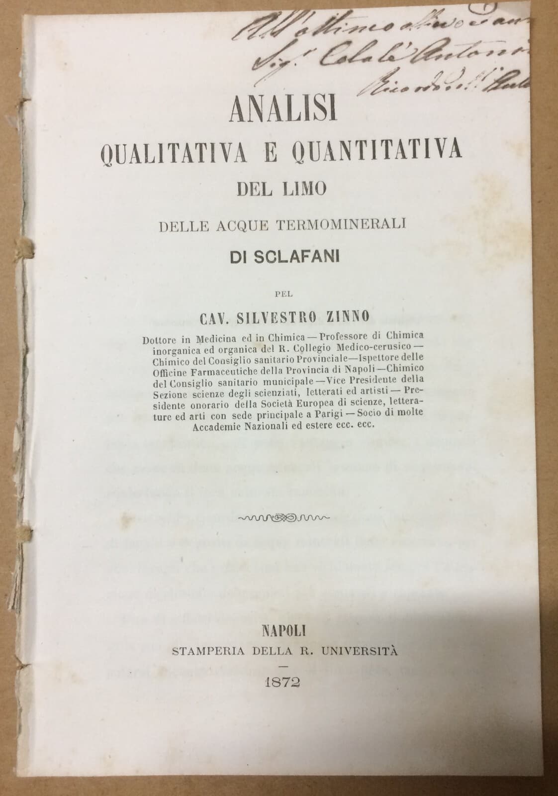 Sicilia, Sclafani: Analisi Qualitativa E Quantitativa Del Limo Delle Acque Termominerali. Silvestro Zinno, 1872