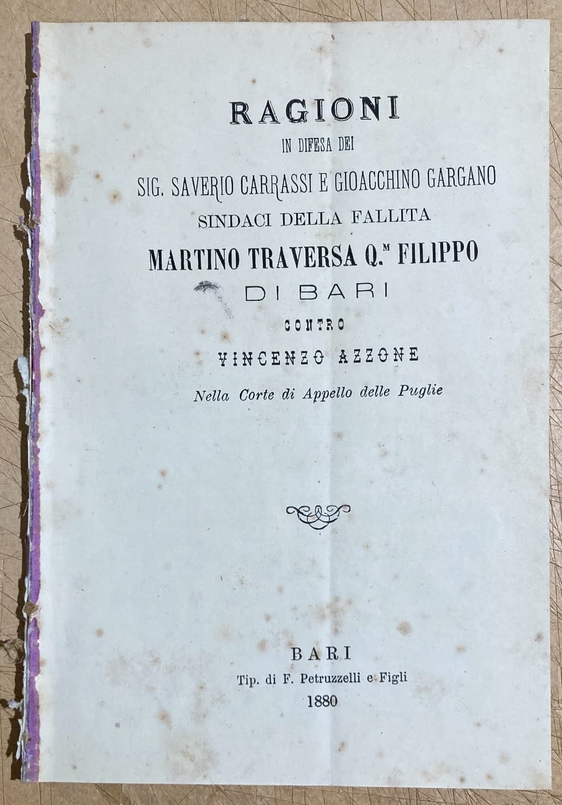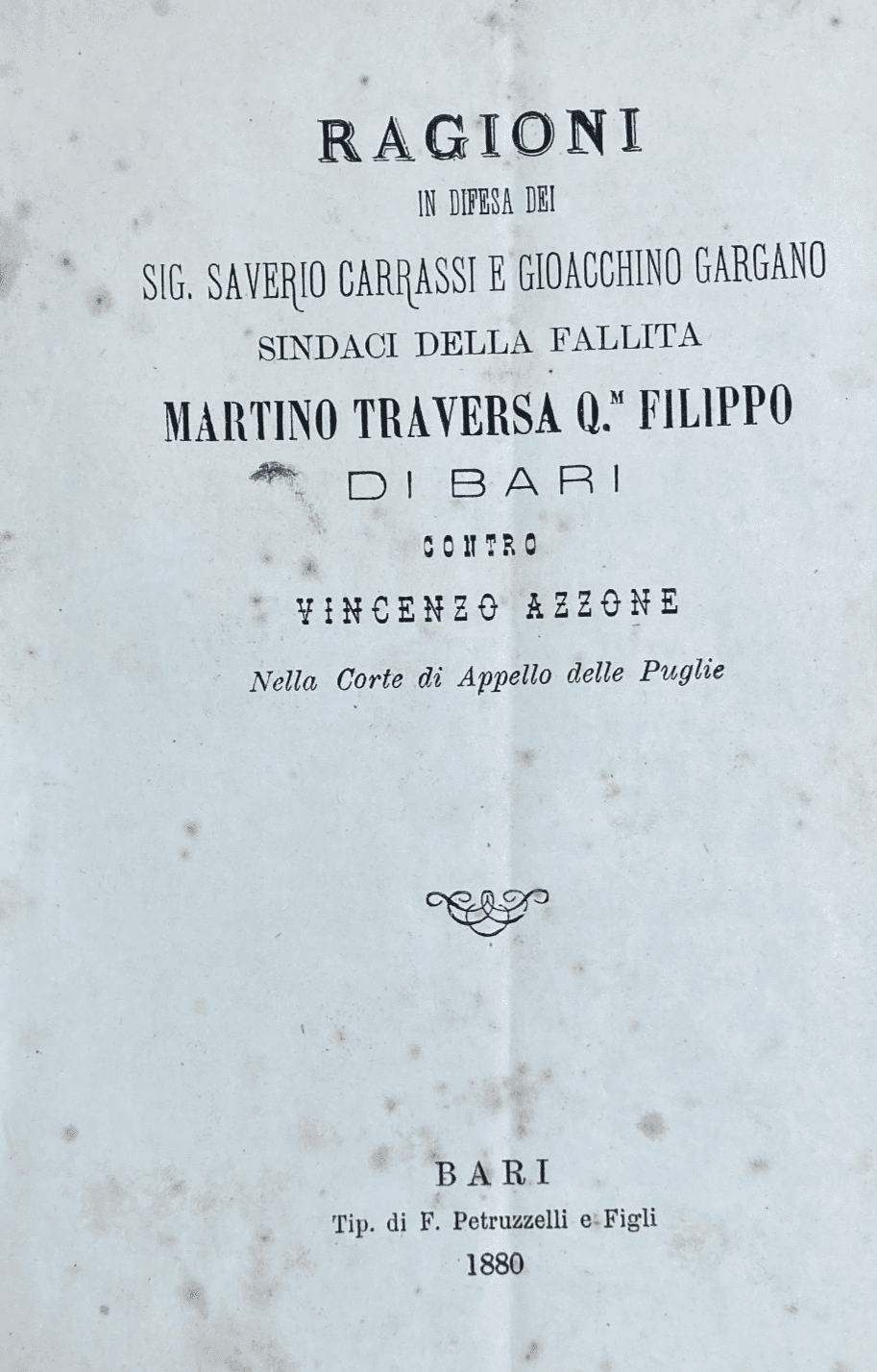 Puglia, Bari: Economia E Giurisprudenza. Fallimento Traversa, Carrassi, Gargano, Azzone, 1880