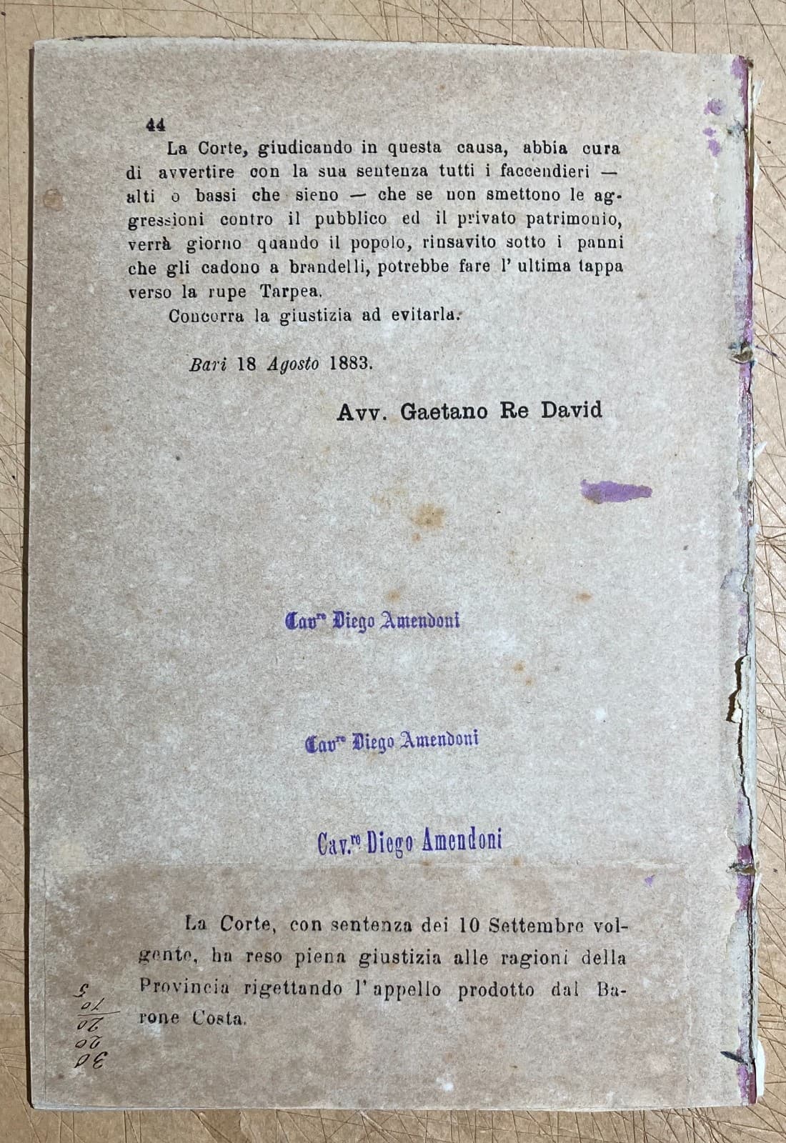 Puglia. Giuridica, Bari: Barone Costa E La Ferrovia Barletta Spinazzola. Re David, 1883