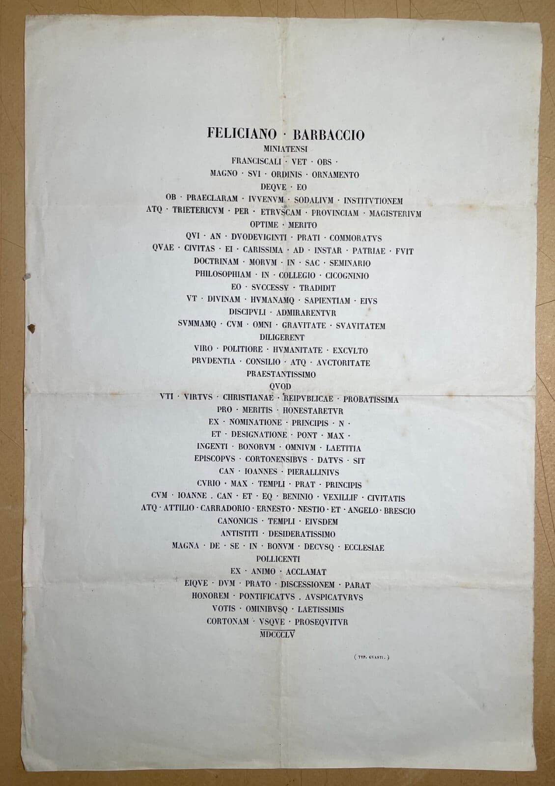 Toscana San Miniato Cortona Feliciano Barbaccio Antico Foglio Volante 1855