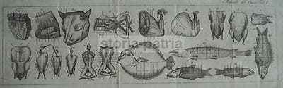 Cucina, Gastronomia, Cuoco: Preparazione Di Carne E Pesce, Tagli, Antica Incisione
