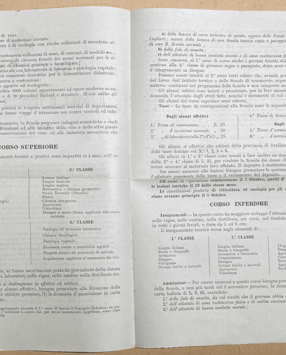 Viticoltura, Enologia, Avellino: Programma Scolastico Antico Pieghevole 1896