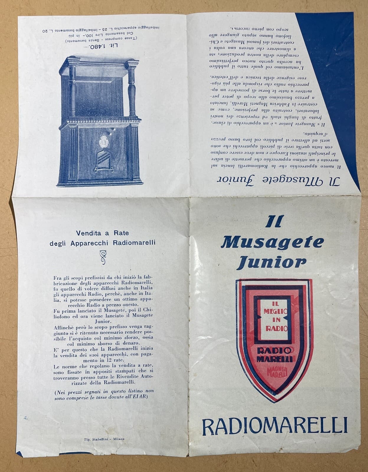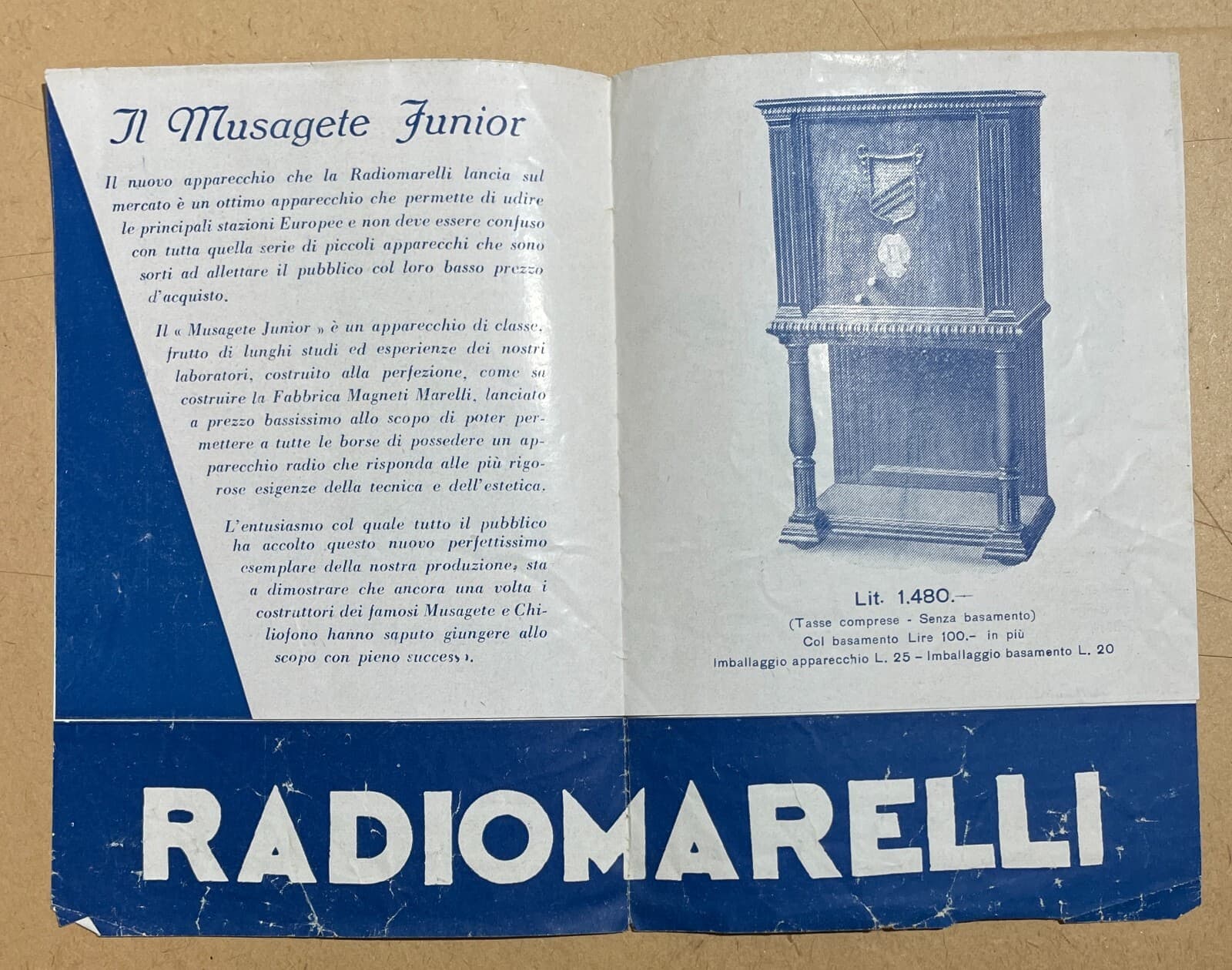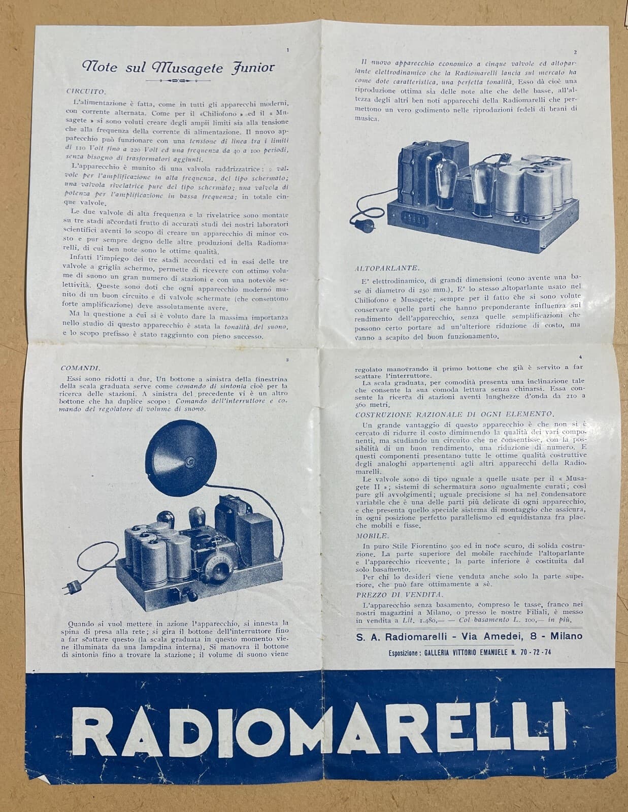 Musica, Radiofonia, Radiomarelli Musagete Junior, Pubblicità d'Epoca, Depliant