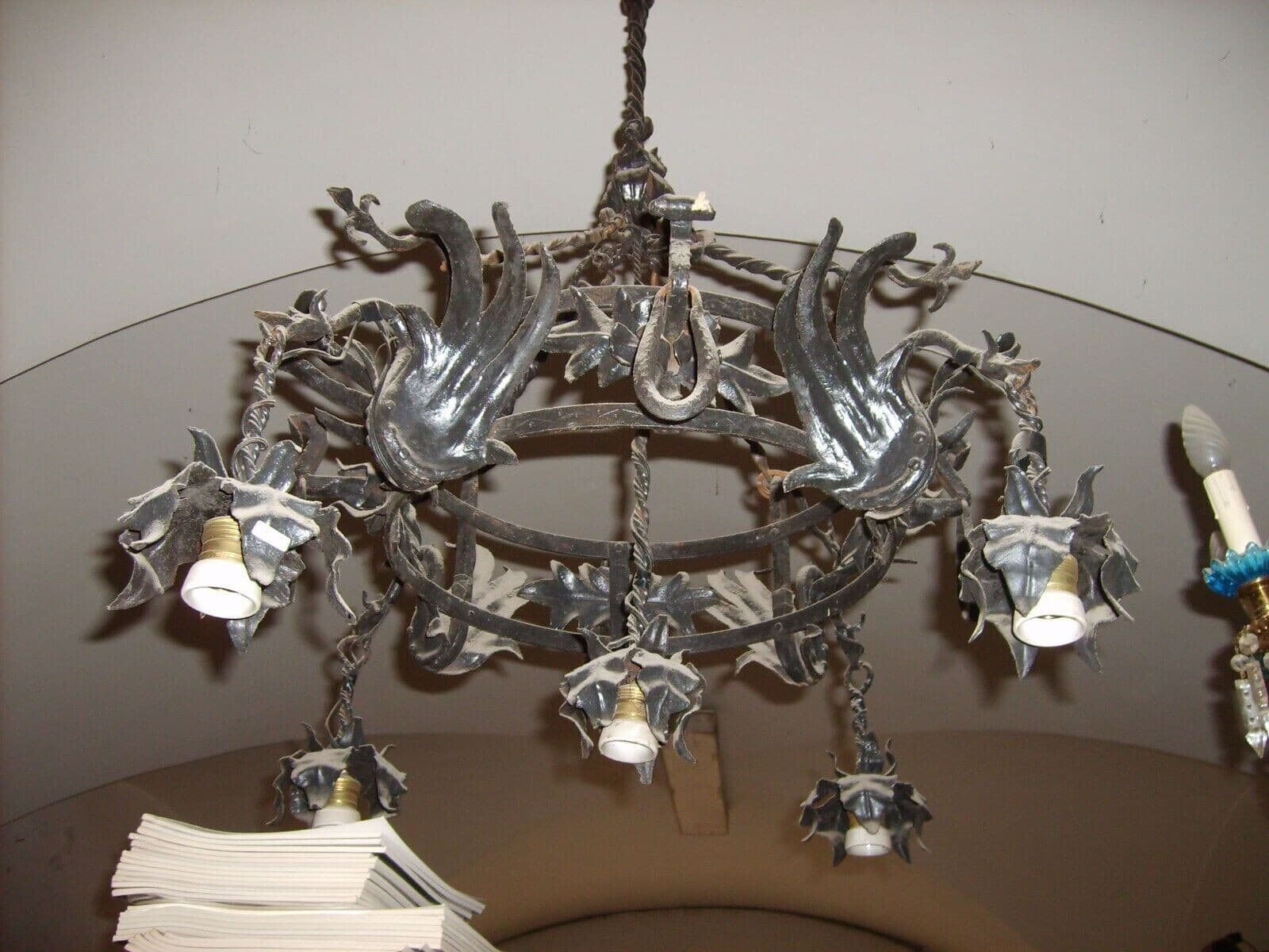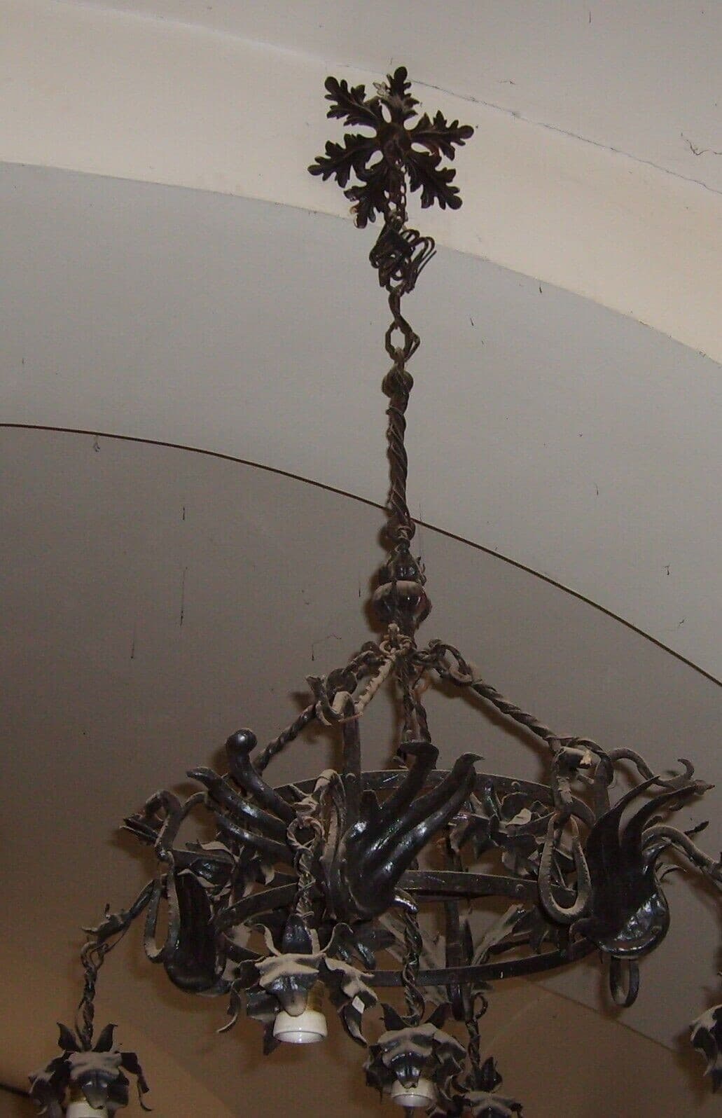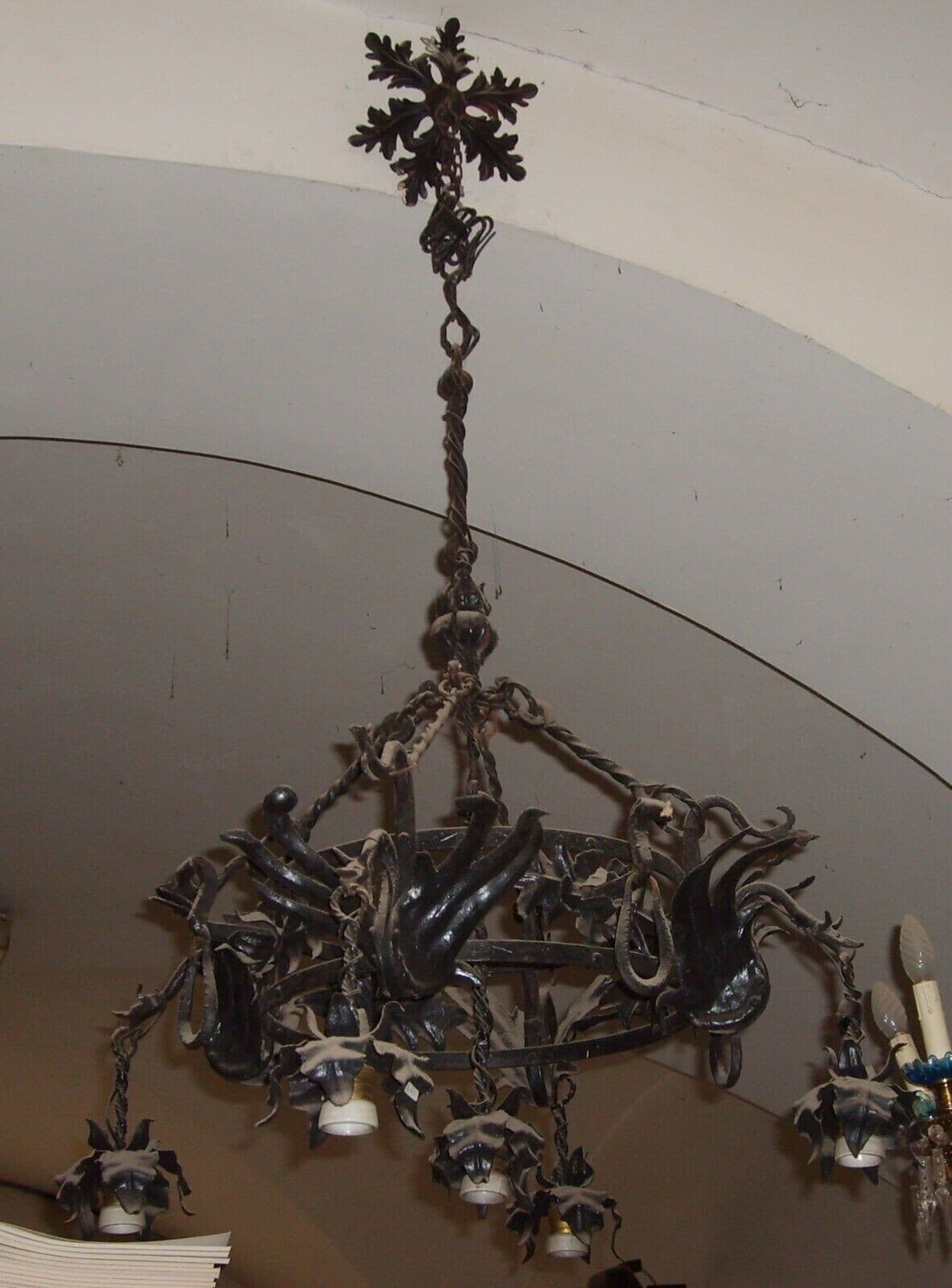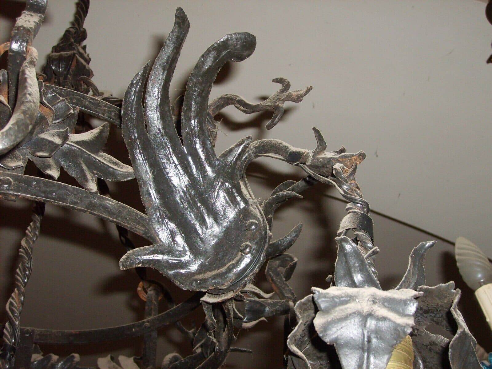 Lampadario Liberty In Ferro Battuto Con Draghi E Motivi Floreali