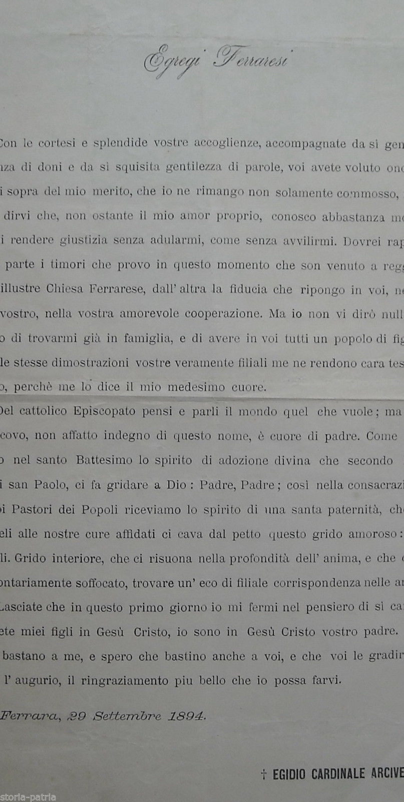 Ferrara, Chiesa, Episcopato, Cardinale Egidio Arcivescovo, Messaggio Ai Ferraresi