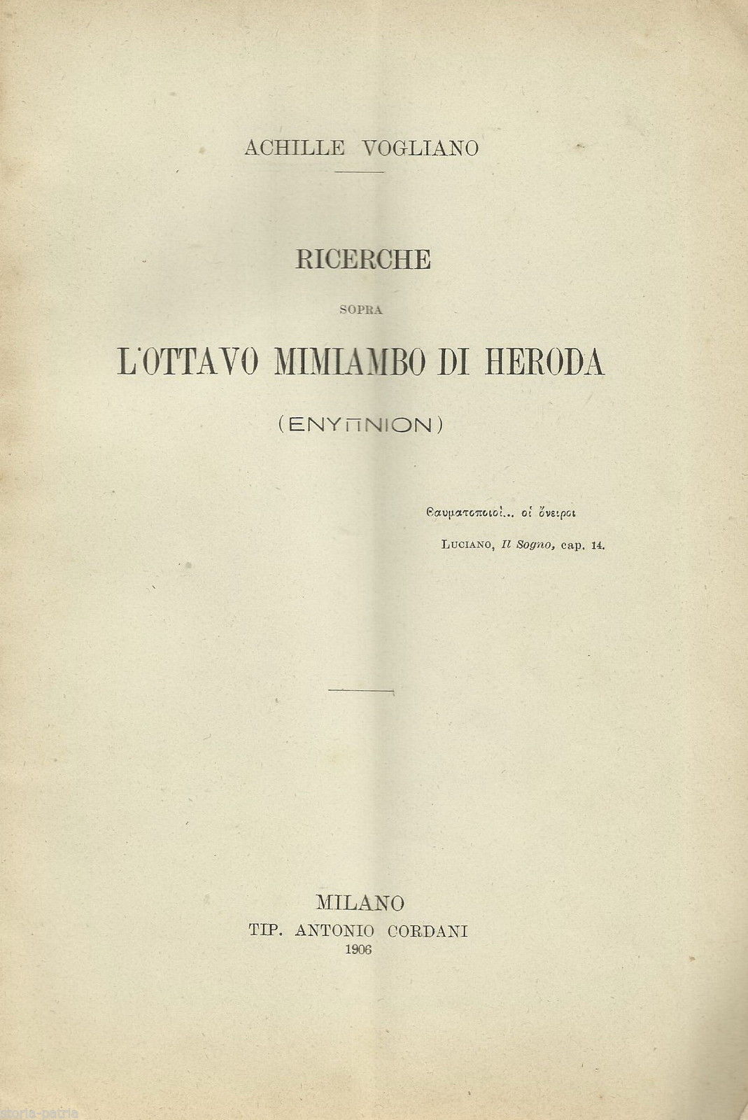 Letteratura, Filologia, Papiri, Lottavo Mimiambo Di Heroda, Con Excursus, Vogliano