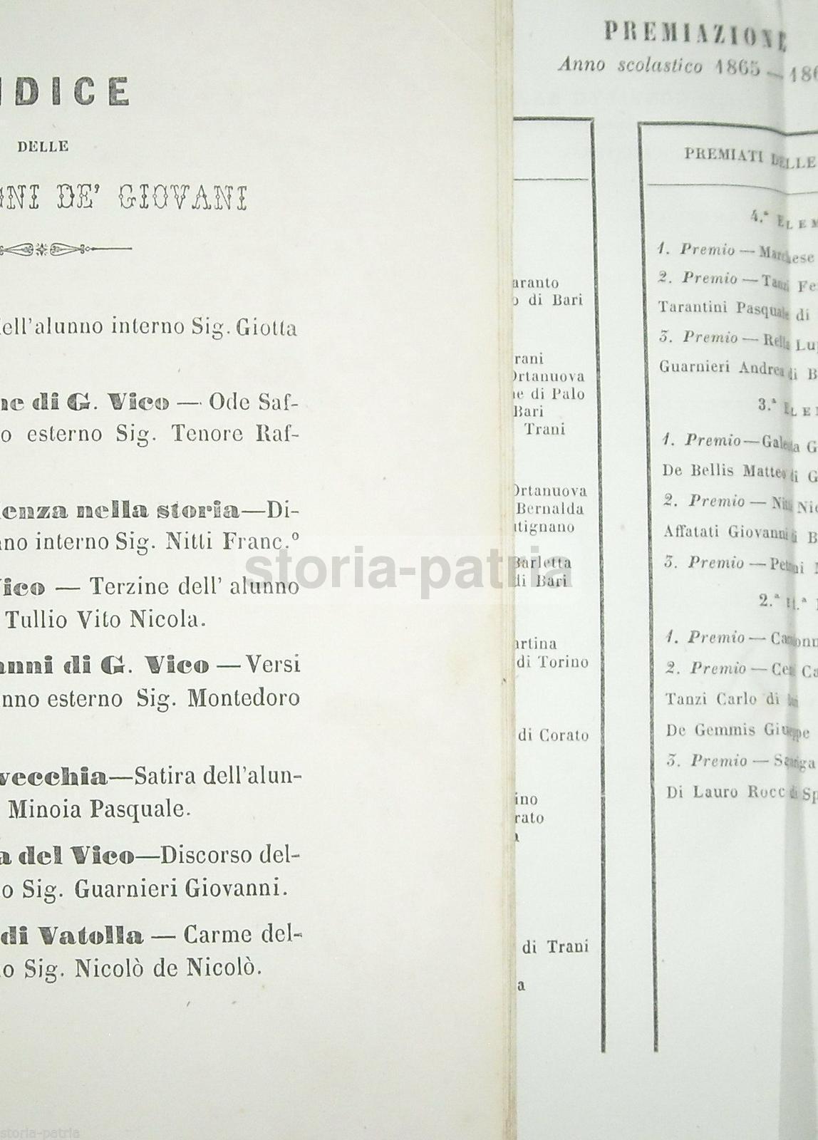 Puglia, Bari, Corato, Ceglie, Toritto, Grumo, Scuola, Filosofia, Vico, Premiazione, 1867