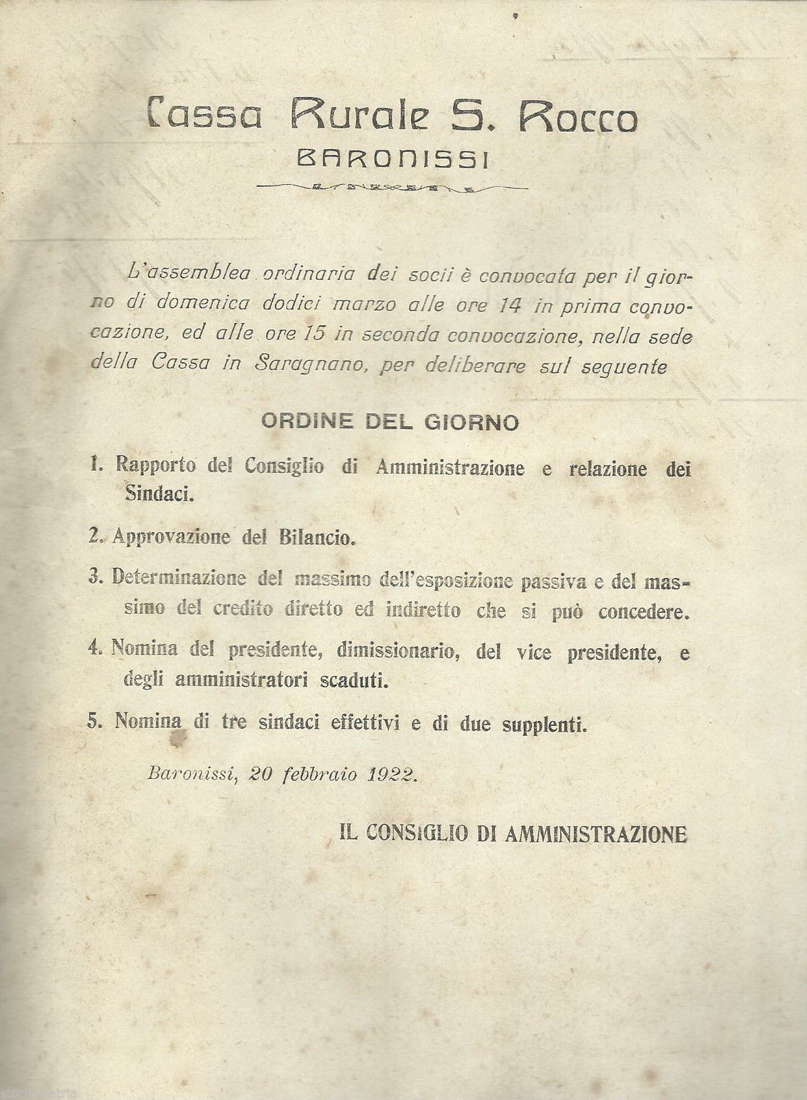 Salerno, Baronissi, Saragnano, Economia, Banche, Cassa Rurale S Rocco, Volantino, 1922