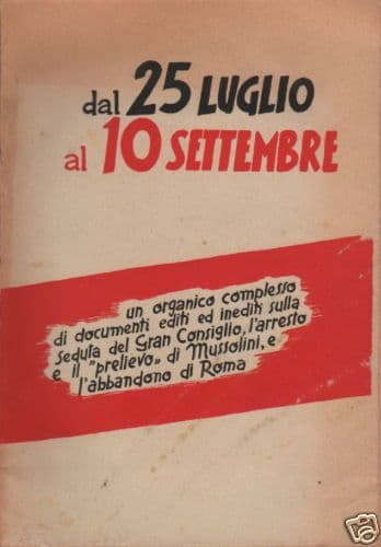 Dal 25 luglio al 10 settembre Nuove testimonianze ..... Roma, SAIG, 1944 Cm.21, pp. 62, bross. edit. (difetti) Interessante edizione originale antica e d'epoca, pubblicazione relativa agli eventi occorsi l'anno precedente alla data di stampa, ossia tra luglio e settembre del 1943, eventi connessi alla caduta del fascismo, e all'abbandono di Roma da parte di Mussolini, e con resoconto degli avvenimenti in capitoli così intitolati: *Prefazione (a cura di G.M.)* *Il fallimento del fascismo* *Il convegno di Feltre* *La prima menzogna* *Il ruolo di Ciano* *L'uomo più disubbidito* *L'arresto di Mussolini* *L'avventura di Campo Imperatore e l'abbandono di Roma* Di interesse storico politico culturale e bibliografico *rara edizione originale, solo pochi esemplari noti nel sistema bibliotecario nazionale* Buona conservazione generale, segni e difetti d'uso e d'epoca, sparse fioriture, difetti alle copertine, strappo ad un angolo marginale del frontespizio.