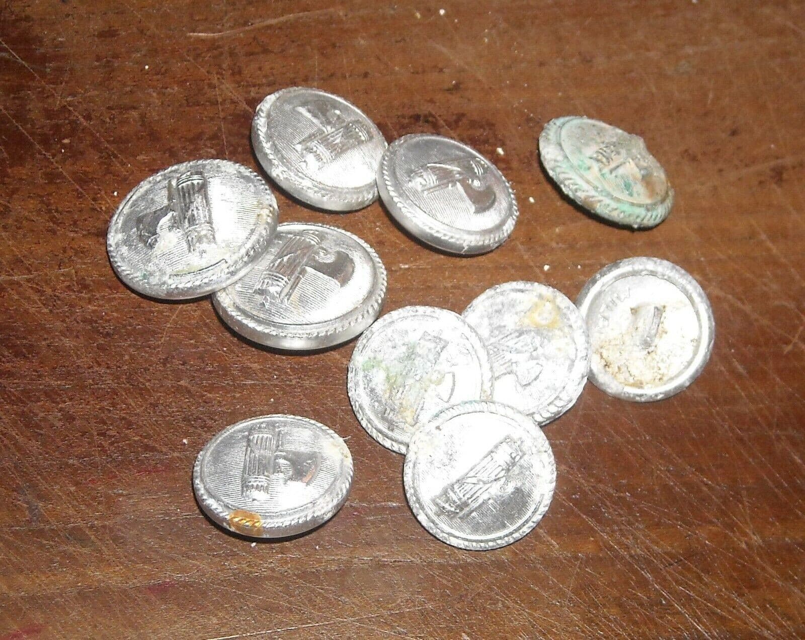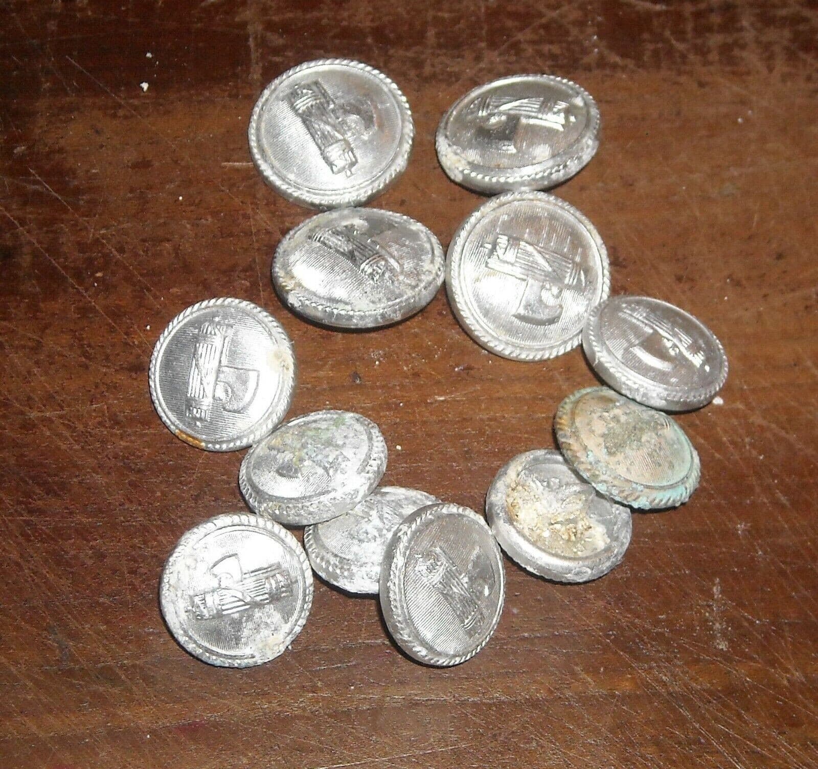Serie di 12 bottoni in metallo bianco, presumibilmente risalenti agli anni '30. Caratterizzati dal motivo allegorico del **fascio littorio** in rilievo, questi esemplari erano originariamente utilizzati per giacche e uniformi militari d'epoca fascista. **Composizione del lotto:** * 4 pezzi con diametro di 2,5 cm. * 8 pezzi con diametro di 2,0 cm. I bottoni sono marchiati internamente con il logo **IZAR** e il simbolo delle tre stelle. **Stato di conservazione:** Modesto. Si rileva ossidazione diffusa, particolarmente sui pezzi più piccoli, e alcuni segni di corrosione. Il lotto necessita di interventi di pulizia o restauro, ideale per il ripristino di divise storiche.