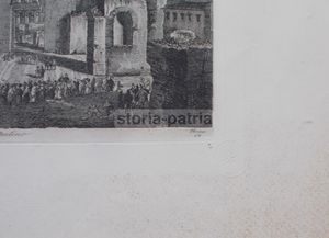 Interessante e scenografica veduta dell'antico monumento romano. L'opera presenta una prospettiva animata con viandanti, pellegrini e scene di vita quotidiana, offrendo una cronaca illustrata di una giornata a Roma.