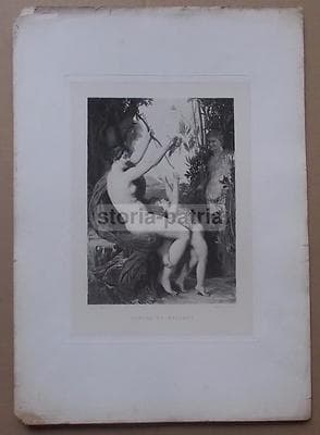 **Eternità**. Raffinata incisione all'acquaforte della metà del XIX secolo (circa 1840). L'opera presenta una complessa raffigurazione allegorica o mitologica con una figura femminile centrale: nella mano destra impugna una penna, mentre sul braccio sinistro riposa un gallo sopra un libro. Accanto sono disposti un calamaio e un peso da orologio a pendolo. La scena poggia su un piedistallo recante l'iscrizione "Eternità". * **Autore**: **Lodovico Ferretti** (incisore) su disegno di **Francesco Pagliuolo**. * **Tecnica**: Incisione all'acquaforte su carta. * **Dimensioni**: Foglio 39x27 cm circa; battuta 29,5x20 cm circa. * **Epoca**: 1840 circa. * **Stato di conservazione**: Buono stato generale. Si segnalano fioriture sparse e difetti marginali dovuti all'epoca; i margini risultano rifilati in modo irregolare.