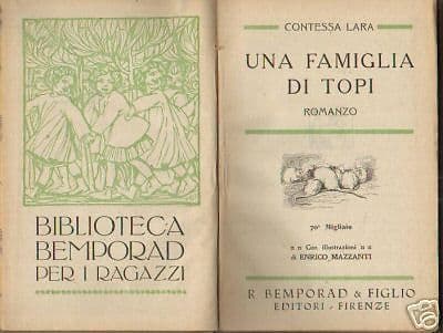 *Contessa Lara* Una famiglia di topi Firenze, Bemporad, 1921. Cm.18, pp.241, telato edit. figur. (difetti) Bella opera narrativa per ragazzi arricchita dalle illustrazioni del noto artista Enrico Mazzanti Opera data in premio ad uno studente molisano, di Campobasso, dal preside Marino, di una scuola elementare locale (pagina manoscritta). Di interesse culturale letterario artistico bibliografico Buona conservazione generale, segni o difetti d'uso o d'epoca. ###### *Contessa Lara (1849-1896) o forse Eva Kattermole, alterò la sua data di nascita, spostandola al 1858, per vanità. Figlia dell'*[*anglosassone*](https://www.italiadonna.it/public/percorsi/biografie/f086.htm#) *Guglielmo Cattermole, console a Cannes, e di Elisa Sandusch, di nazionalità italiana, visse a Firenze per gran parte della sua vita. Imparò l'inglese, il francese e lo spagnolo dal padre, e la musica dalla madre. Fu istruita anche dalla poetessa Marianna Giarrè-Billi, a cui dedicò uno dei suoi racconti più tristi. Grazie all'influenza dello scrittore Francesco dall'Ongaro, un amico di famiglia, pubblicò, a soli diciotto anni, Canti e ghirlande (1867), inizialmente pensato per accompagnare dei fiori donati alla madre. Questa raccolta, stroncata da Croce, risentiva molto dell'influenza di altri poeti. Mentre la giovane donna si faceva strada nella vita dei salotti fiorentini, si stava creando una reputazione come giovane scrittrice neoromantica. In uno dei salotti da lei frequentati, conobbe Eugenio Mancini, che divenne suo marito, nonostante l'avversione della famiglia di lui. Piena di amore romantico, nel 1892, pubblicò L'innamorata, un romanzo semi-autobiografico. Alcuni anni dopo però, le relazioni extraconiugali di entrambi gli sposi sfociarono in un duello, che vide confrontarsi Eugenio Mancini con il suo migliore amico, Giuseppe Bennati. Il secondo ebbe la peggio, e Mancini fu accusato di omicidio, creando uno scandalo. Ma anche l'amante di Eugenio morì, a causa di una dose di acido solforico, e si racconta che Evelina le tagliò tutti i lunghi capelli, che legò ad un velo e pose sulla tomba del suo amato. Dopo quell'evento, i due coniugi non si rividero più. A partire dal 1875, Evelina iniziò a collaborare con diversi quotidiani e riviste, iniziando la sua breve vita da giornalista. In questo secondo periodo della sua vita, iniziò, pare, una relazione con lo scrittore Mario Rapisardi, che sicuramente favorì la pubblicazione del suo secondo volume di poesie, Versi (1883), uscito con lo pseudonimo di Contessa Lara. A questa seguirono, nel 1886, un'altra raccolta, intitolata Ancora Versi, e diversi libri per bambini, che ebbero un grande successo. Dopo la sua morte, inoltre, furono pubblicate diverse opere in prosa ed una raccolta di poesie. Nel 1896, la Contessa Lara fu assassinata dal suo amante Giuseppe Pierantoni, che le sparò. Questo straordinario omicidio, unito ad una vita pubblica costellata di scandali, conferirono a questa scrittrice un'aura "bizantina", che ben si adattava alla voga del tempo.(dal web)*
