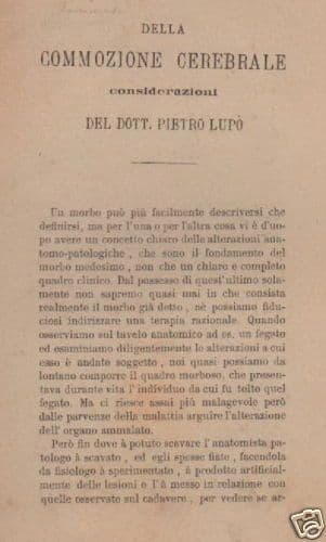 Pietro Lupo' Della commozione cerebrale Considerazioni .... S.i.t., s.d. (Napoli ?, fine '800) Cm.22, pp.16, vecchia brossura muta (difetti) Interessante edizione antica e d'epoca, con una dissertazione specialistica medico-legale e anatomo patologica, in cui l'autore si sofferma anche sull'etimologia della parola commozione (attibuita anche ad Ippocrate, al Galeno, e ad altri); *ampia disamina sulle alterazioni molecolari del cervello in seguito ad urto o trauma del cranio, e curiose riflessioni su eventi e conseguenze delle oscillazioni del cervello nel cranio, come succede per esempio in seguito ad uno schiaffo, ...il tutto al fine di poter capire perchè in certe situazioni una pur comune commozione cerebrale possa portare al coma e alla morte, problematiche che l'autore ovviamente cerca di investigare basandosi sulla propria esperienza e cultura e facendo capo alla pur limitata bibliografia specialistica dell'epoca, con il principale intento anche di confutare la teoria del Fischer.* Opera di interesse specialistico medico neurologico ortopedico angiologico e bibliografico *nessun esemplare noto nel sistema bibliotecario nazionale* Buona conservazione generale, segni e difetti d'uso e d'epoca, sparse fioriture, annotazioni, senza legatura e pertanto meritevole di rilegatura.