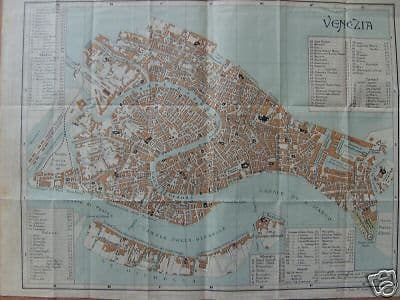 **Venezia** Bella e interessante antica mappa topografica della celebre città veneta, con i suoi numerosi canali, e gli innumerevoli palazzi e altri siti di interesse storico artistico monumentale e turistico...la Piazza d'Armi, la Giudecca, il Canal Grande, l'Isola di S. Giorgio, le darsene, la stazione,... Grandi dimensioni, misura cm. 36,5x47,5 circa (intero foglio, compresi i margini bianchi irregolari e diseguali); impressa da Treves (Milano), probabilmente tratta da una antica guida storico-turistica o di viaggio in Italia della fine dell'800. **     ** **Decorativa e da collezione!** *Buona conservazione generale, segni e difetti d'uso e d'epoca, inevitabili numerose piegature, sgualciture o strappetti marginali; degna di essere montata sotto passpartout ed incorniciata.*