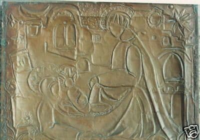 Bella antica e rara raffigurazione di Natività Inusuale interessante e originale opera scultorea a sbalzo di un artista abruzzese dell'800, con bell'effetto stilizzato, esemplare di gusto e decorativo, opera firmata Marchioli attivo in area abruzzese (Pescara-Chieti ?), nella seconda metà dell'800. Misura cm.39x50 circa; pannello ottenuto con lavorazione a mano a sbalzo su rame. Rarità d'epoca di interesse artistico, collezionistico, folclorico e decorativo Importante esempio di arte popolare tradizionale abruzzese. Discreta conservazione generale, segni e difetti d'uso e d'epoca, inevitabili ammaccature o ossidazioni, degno di eventuale restauro o di una semplice risistemata, e meritevole di incorniciatura; il tutto così come da immagini allegate, così come rinvenuto in una antica collezione di famiglia. *(l'immagine allegata è un particolare dell'intera opera, a richiesta eventuali altre informazioni)* *#########* *Sono vietate riproduzioni delle immagini senza autorizzazione*