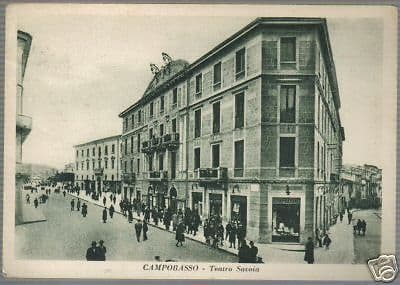 Campobasso Teatro Savoia **Bella antica e rara veduta della nota città molisana, con il prospetto del Teatro, e la via animata da numerosissime persone, con anche un carretto e una bicicletta.** Cartolina originale e d'epoca, viaggiata e affrancata, spedita probabilmente negli anni '30; edizione Di Tota ved. Colitti, da una foto di Chiodino. Cm. 10,5x15 circa. Di interesse storico-locale e collezionistico **Buona conservazione generale, segni o difetti d'uso e d'epoca, lievi difetti marginali.**