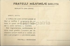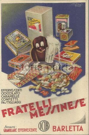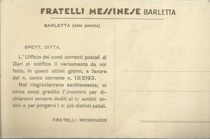 Rara cartolina pubblicitaria d'epoca della nota azienda dolciaria Fratelli Messinese, con sede a Barletta.