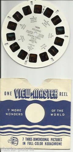 View-Master Italia South Tyrol Bolzano *7 fotografie a colori in rilievo* Interessante raccolta di sette immagini fotografiche, relative alla nota città tirolese, vedute fotografiche inserite in un disco cartaceo, che potevano (e possono) essere visionate inserendo il disco in un apposito apparecchio o visore stereo, con visione tridimensionale o stereo, per cui ogni veduta corrisponde a due fotogrammi, quindi complessivamente per sette vedute sono presenti intorno al disco 14 fotogrammi; presenti vedute di: *Mendola Pass to Bolzano* *The Fertile Valley* *A Roadside Shrine* *Piazza Walther at Bolzano* *Bolzano Square* *Alpine Troops* *Farm Scene near Bolzano* disco di circa cm. 9 (diametro), inserito in astuccio di circa cm.9x9; edizione Sawyer's Inc. (Portland, Oregon, USA); databile alla metà del '900 (circa anni '60 ?) Di interesse storico-locale, fotografico, collezionistico Buona conservazione generale, usuali segni e difetti d'uso e d'epoca. ##### della stessa serie sono disponibili anche dischi con vedute fotografiche di altre città italiane ed estere, eventuali ulteriori informazioni a richiesta.