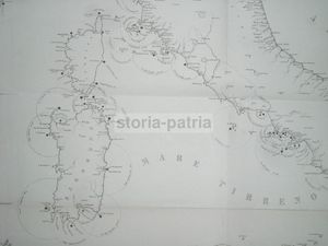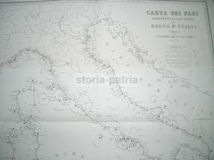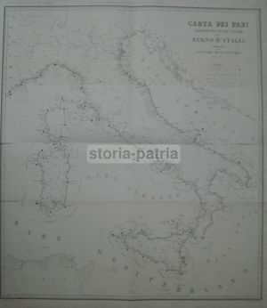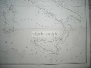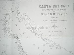 Carta dei fari esistenti sulle coste del Regno d'Italia. Pubblicata dal Ministero dei lavori pubblici, Gennaio 1865. Questa rilevante mappa geografica d'epoca illustra la cartografia dell'intera penisola italiana, evidenziando specificamente le aree portuali e i punti costieri dotati di fari, strumenti indispensabili per la navigazione marittima ottocentesca. Località descritte: L'intera costa adriatica (da Chioggia al Capo di Leuca), il golfo di Taranto, le costiere della Calabria, del Napoletano (incluse Ischia e Capri), Gaeta, Ponza, i litorali del Lazio, della Toscana, della Liguria e della Costa Azzurra (Nizza, Cannes). Sono inclusi anche i fari di Sardegna, Corsica, Sicilia, Elba, Malta e delle coste dalmate (Istria, Trieste). Dettagli tecnici: Incisione antica curata dall'incisore Luigi Balatri, impressa dalla Calcolitografia Rolla di Torino per conto del Genio Civile. Dimensioni: 56x49,5 cm circa (parte figurata). Condizioni: Discreta conservazione generale. Presenta fioriture sparse, pieghe originali di pubblicazione (con alcuni rinforzi sommari), strappetti marginali e segni d'uso coerenti con l'epoca. Foglio unico impresso al recto con verso bianco.