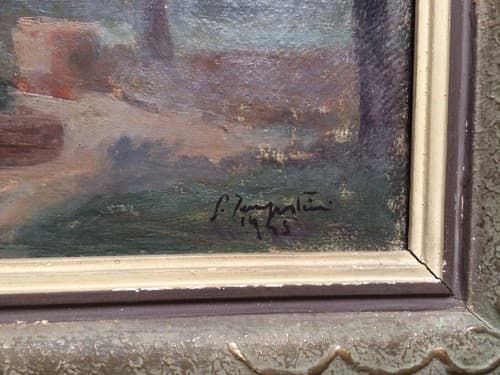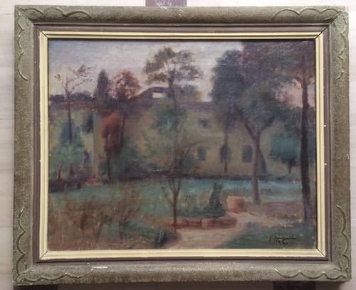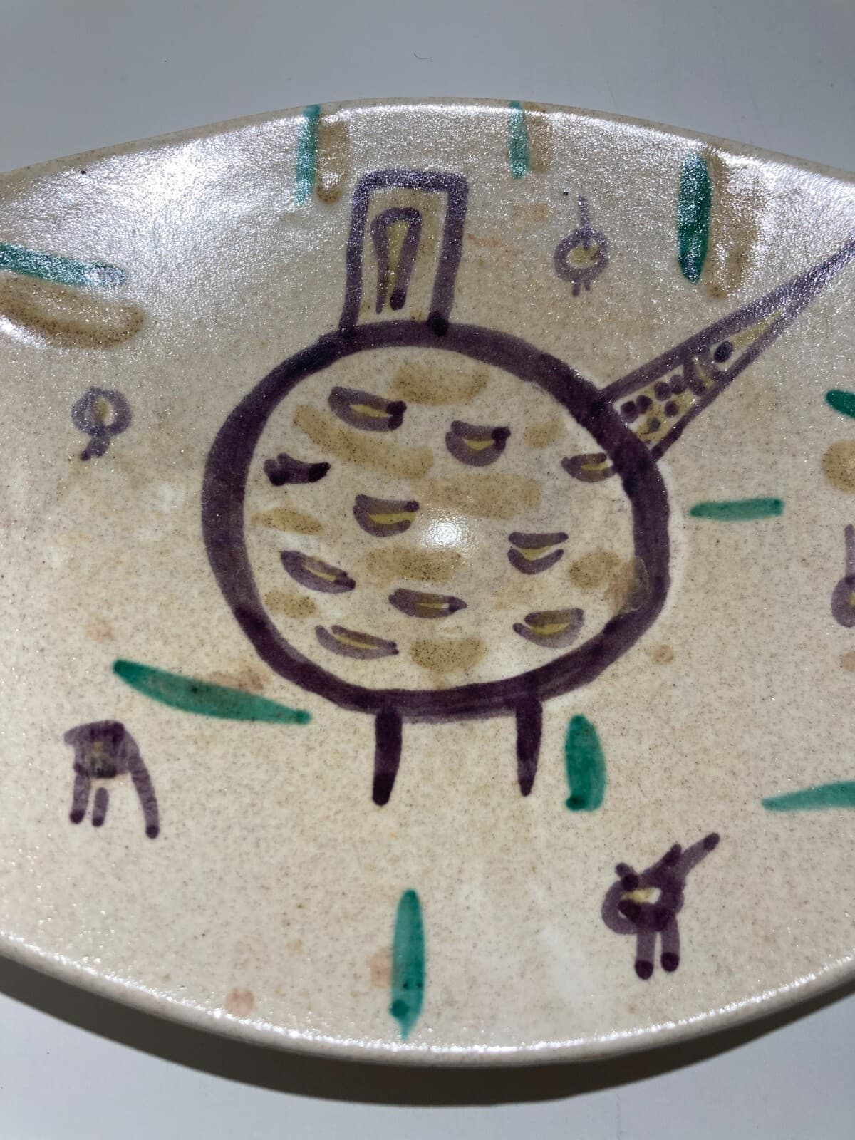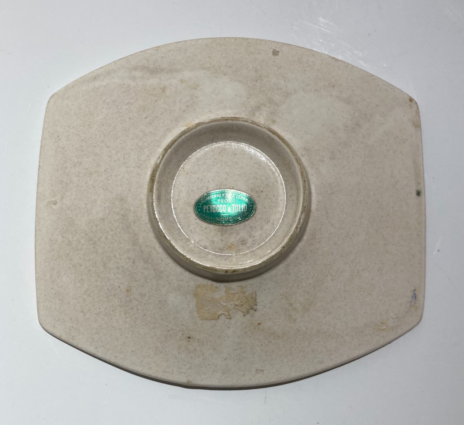 **Laurana**. Interessante e decorativo soprammobile, vassoietto artistico in metallo smaltato con decorazione informale di tipo floreale policroma. * **Manifattura**: Laurana. * **Materiale**: Metallo smaltato (probabilmente rame). * **Dimensioni**: 22x20x5 cm circa. * **Datazione**: Seconda metà del Novecento (datato 1976 tramite incisione). * **Condizioni**: Segni d'uso e d'epoca, etichetta originale parzialmente abrasa, fascino del pezzo vissuto con tracce di usura superficiale.