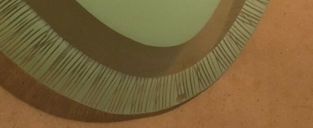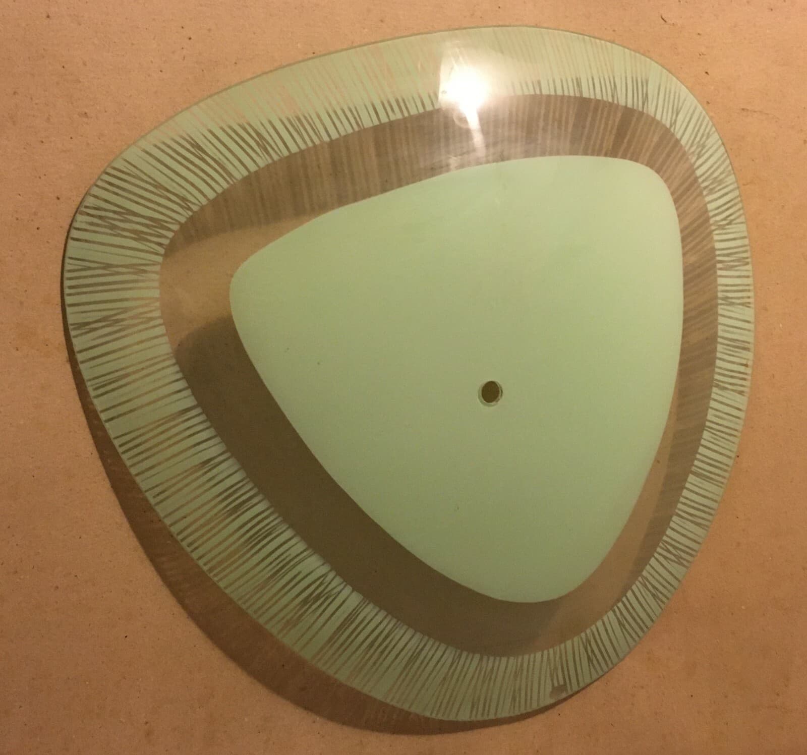 Antica lampada a petrolio d'epoca, caratterizzata da un serbatoio in vetro verde dalla sagomatura insolita. Il corpo vitreo presenta una colorazione verde oliva ed è sormontato da una macchinetta metallica portastoppino in ottone. **Caratteristiche fisiche:** * **Dimensioni:** circa 11 cm il diametro alla base; circa 5 cm l'altezza della parte vitrea. * **Marchi:** Sotto la base è impresso un marchio figurato raffigurante un'aquila stilizzata, probabile simbolo di fabbrica, accompagnata dal numero 3. * **Materiali:** Vetro soffiato a stampo e ottone. **Condizioni di conservazione:** L'oggetto si presenta in stato di conservazione modesto. Sono evidenti i segni del tempo, ossidazioni diffuse sui componenti metallici e polvere. Il meccanismo in ottone è attualmente bloccato e la manopola per la regolazione non è funzionante. È presente un residuo dello stoppino originale.