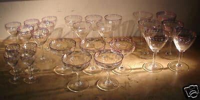 Interessante insieme di bicchieri in vetro a forma di calice e di varie dimensioni con bella e pregevole lavorazione incisa e colorata lungo tutto il bordo. Esemplari di un vecchio servizio di famiglia, di cui sono disponibili 26 pezzi, calici di varie dimensioni, per acqua vino rosolio o spumante, il tutto come da immagini allegate.   Nessun marchio o firma notata, ma probabilmente produzione di nota vetreria, forse veneziana forse Venini o Baccarat o altra ancora che collezionisti specialisti sapranno meglio identificare. I pezzi disponibili hanno dimensioni variabili in altezza: da 10, 11, 12, 13, 14 cm. Raccolta interessante e di pregio, decorativa o da collezione o di pratico utilizzo Buona conservazione generale, usuali segni d'uso o d'epoca, ma probabilmente mai utilizzati *(a richiesta eventuali ulteriori informazioni)*