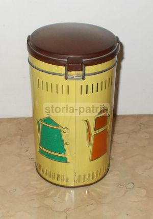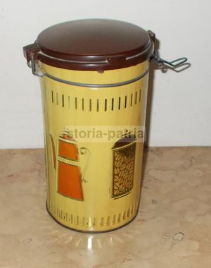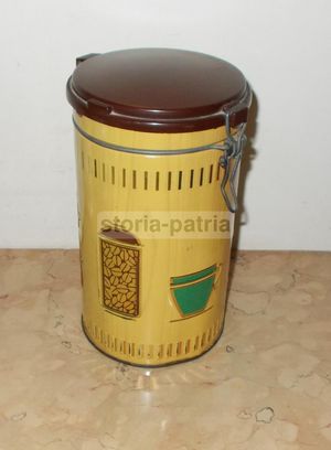 - Materiale: latta cromolitografata; coperchio incernierato in plastica dura marchiato Pagani (Lecco).