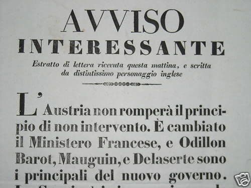 Raro antico ed originale foglio volante, contenente un Avviso interessante *"Estratto di lettera ricevuta questa mattina, e scritta da distintissimo personaggio inglese"* *........* Esemplare di grande interesse storico, relativamente ai fatti insurrezionali che coinvolsero la Savoia per una giusta causa di libertà. Manifesto datato Bologna 6 marzo 1831 Edito in Macerata, Tipografia Mancini-Cortesi Esemplare di interesse collezionistico per le varie tematiche collegate **(Savoia, Piemonte, Marche, Emilia Romagna, Francia, Odillon, Barot, Mauguin, Delaserte,...)** Misura cm.41x28; buona conservazione generale, segni e difetti d'uso o d'epoca, forellini agli angoli, piegature o sgualciture, ***meritevole di essere inserito sotto passpartout ed incorniciato*.** *(l'immagine allegata raffigura un particolare dell'intero foglio, la parte superiore con l'intestazione, eventuali altre informazioni a richiesta)*