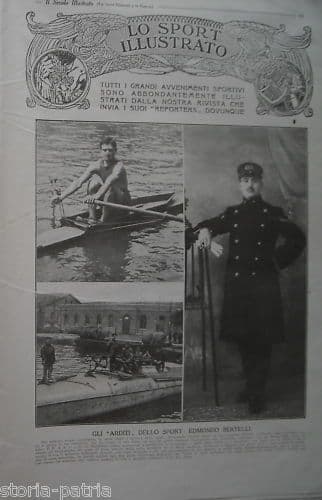 Gli arditi dello sport Edmondo Bertelli *Interessante antica illustrazione,* *raffigurante tre immagini fotografiche relative ad un canottiere che legò il suo nome alla impresa di Rizzo, col M.A.S. 20,* *ben noto per aver superato lo sbarramento di Pola nel 1916;* *nell'equipaggio vi era il milanese Edmondo Bertelli, qui raffigurato in divisa e durante la Milano-Abbiategrasso, al suo debutto in schiff, nel 1911;* foglio volante, impresso al recto verso bianco, , probabilmente in origine edito quale supplemento o inserto o illustrazione del periodico Il Secolo Illustrato; misura circa cm. 34x25; databile alla prima metà del '900. Di interesse storico, militare, sportivo, collezionistico Buona conservazione generale, segni e difetti d'uso e d'epoca, piegature o sgualciture o difetti vari marginali, **meritevole anche di essere inserito sotto passpartout ed incorniciato.**