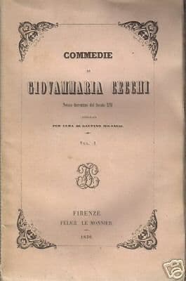 Cecchi Giovammaria Commedie di ..... *Notaio fiorentino del secolo XVI* Firenze, Le Monnier, 1856 Cm.18,5; pp.607+555; bross. edit. Interessante edizione curata da Gaetano Milanesi relativa alle composizioni edite ed inedite del notaio fiorentino Cecchi, notaio di professione ma amante delle belle lettere e incline all'arte comica sopratutto sotto l'influsso delle letture di Plauto e Terenzio. Impossibile sintetizzare l'ampio e articolato contenuto di questi due grossi e distinti volumi, unici due disponibili ma con rappresentazioni a sè stanti: *Il figliuol prodigo (ambientata in Firenze)* *Il diamante (ambientata in Firenze)* *I rivali (ambientata in Pisa)* *Gli sciamiti (ambientata in Siena)* *Le pellegrine (ambientata in Firenze)* *Morte del re Acab* *Il martello (ambientata in Firenze)* *L'ammalata (scena in Firenze)* *Le cedole (scena in Firenze)* *La Maiana (scena nella Villa di Maiana sotto Fiesole)* *Lo sviato (scena in Firenze)* *La conversione della Scozia (scena in Dora, Scozia)* Numerose le citazioni di personaggi e località. Una delle pregevoli edizioni originali del noto editore fiorentino Le Monnier. Di interesse culturale teatrale letterario e bibliografico Buona conservazione generale, segni e difetti d'uso e d'epoca, usuali diffuse fioriture, parzialmente ancora a fogli chiusi. **@@@@@@** **Importante** **Invito a fare offerte solo se veramente interessati all'articolo,** **e per ogni dubbio in merito chiedere ulteriori informazioni e immagini esclusivamente durante l'asta.** **Per facilitare ed accelerare la spedizione, indicare sempre nella causale del pagamento il titolo dell'oggetto acquistato.** **Il pagamento deve essere effettuato entro 3 giorni lavorativi dalla data di chiusura dell'asta (dilazioni di tempo devono essere concordati, salvo per più acquisti a scadenza diversa), in caso contrario chiederò ad Ebay il rimborso delle commissioni e vi segnalerò come** *offerente non pagante* **lasciandovi un feedback negativo.** **Normalmente e salvo imprevisti spedisco entro il giorno successivo alla ricezione del pagamento.** **Effettuo solo spedizioni certificate da ricevuta (posta raccomandata, pacco normale o celere, corriere) e pertanto evitate di chiedermi spedizioni in posta prioritaria o ordinaria (metodi non sicuri).** **Ogni spedizione viaggia a totale rischio dell'acquirente, che però può cautelarsi indicando un metodo di spedizione o un corriere di sua scelta e gradimento.** *Vendita tra privati e senza alcuna forma di garanzia o di restituzione; l'articolo in asta è come descritto nella scheda e come presentato nelle fotografie allegate, visto e piaciuto, e pertanto chi intenda fare offerte o proposte di acquisto può chiedere ulteriori informazioni esplicative esclusivamente prima dell'acquisto; l'acquirente accetta, senza riserve, l'esclusione di qualsiasi forma di garanzia o restituzione, salvo accordi diversi da definirsi prima della chiusura dell'asta.* *Grazie per l'attenzione!* *\======* *I invite to watch the others my auctions* Creato da [Turbo Lister](https://pages.ebay.it/turbo_lister/)