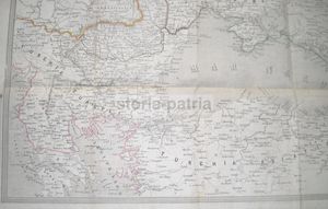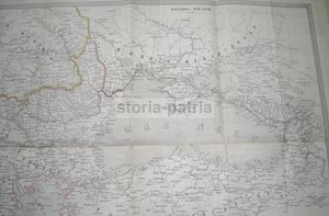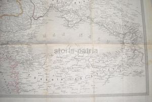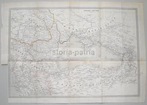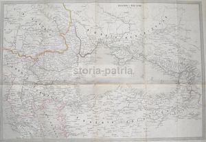 Mappa antica e d'epoca raffigurante il bacino del Danubio e del Mar Nero.\n\nLa cartografia, risalente alla metà dell'Ottocento (circa 1854), illustra con estremo dettaglio l'orografia e l'idrografia di una vasta area tra Europa, Russia e Asia.\n\nTra i territori visibili:\n *Ungheria, Transilvania, Valachia, Bulgaria e Moldavia;\n *Crimea, Caucaso e Russia Meridionale;\n *Grecia, Morea, Isole Ionie;\n *Turchia Europea e Asiatica, Armenia.\n\nDettagli tecnici:\n Tecnica: Stampa litografica con confini colorati a mano.\n Dimensioni: Foglio di circa 37x50 cm.\n* Provenienza: Probabile tavola fuori testo da un'opera geografica d'epoca.\n\nStato di conservazione: L'esemplare presenta segni del tempo quali fioriture, bruniture e pieghe tipiche delle mappe originariamente rilegate. Il margine sinistro è parzialmente mancante nella parte inferiore a causa della precedente rilegatura. Uno strappo marginale è presente, ma complessivamente la mappa si presta a essere incorniciata con un passpartout.