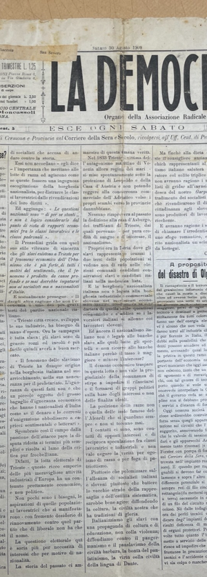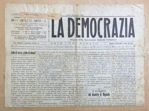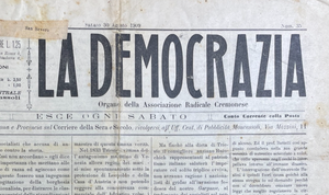 La Democrazia, organo dell'Associazione Radicale Cremonese, pubblicato a Cremona (Tip. Foroni) il 30 agosto 1909.