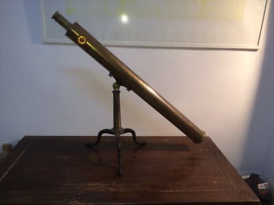 Interessante antico strumento ottico scientifico, un cannocchiale di grandi dimensioni completo di supporto originale (trespolo). Questo esemplare rappresenta un oggetto di notevole impatto visivo, ideale per arricchire uffici di prestigio, studi professionali o interni eclettici. **Specifiche tecniche:** * **Dimensioni:** Lunghezza totale (chiuso) circa 96 cm; diametro circa 8,5 cm. * **Supporto:** Altezza del trespolo circa 40 cm. * **Materiali:** Metalli vari (ottone e ferro) con lenti ottiche vitree. * **Marchio:** Firmato dall'artefice **J.F. Hunt** di *Hull*. * **Epoca:** Databile presumibilmente alla metà o alla seconda metà del XIX secolo. **Condizioni di conservazione:** L'oggetto si presenta in uno stato di conservazione modesto, con evidenti segni del tempo e dell'uso. Si segnalano tracce di ossidazione, polvere, abrasioni diffuse e alcune ammaccature (una più marcata). La funzionalità ottica non è garantita e la parte interna delle lenti sembra incompleta. L'articolo richiede interventi di pulizia, lucidatura e restauro professionale; viene ceduto nello stato di fatto come pezzo da collezione o elemento d'arredo.