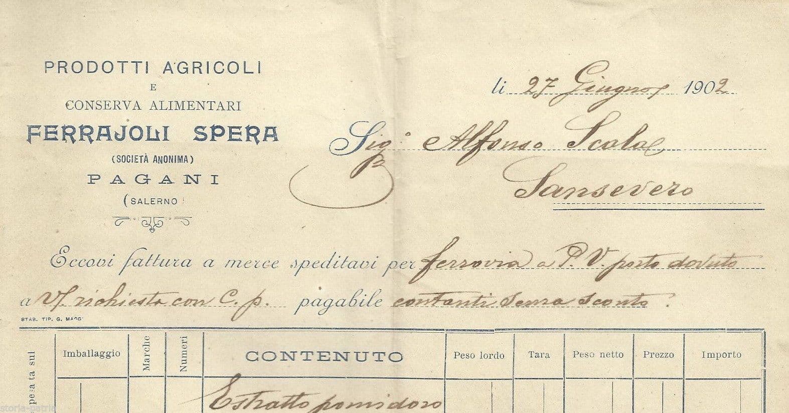 Ferrajoli Spera *(Società Anonima)* *Prodotti agricoli e conserva alimentari* ***Pagani (Salerno)*** Interessante antica e rara stampa pubblicitaria, foglio volante con intestazione pubblicitaria della nota ditta salernitana, specializzata nella vendita di prodotti alimentari, foglio volante formato carta da lettera, di circa cm.30,5x20,5; utilizzato quale scheda prestampata per commissioni o ordini e fatture, con indicazioni manoscritte relative ad una spedizione di estratto di pomodoro, inviato ad un cliente alimentarista pugliese, della provincia di Foggia; missiva datata giugno 1902. Di interesse storico-locale, specialistico, pubblicitario, collezionistico Buona conservazione generale, segni e difetti d'uso e d'epoca, fioriture e bruniture, strappo al margine inferiore, piegature e sgualciture e difetti vari marginali; **meritevole anche di essere inserito sotto passpartout ed incorniciato.** *(l'immagine allegata raffigura **un particolare** dell'intero foglio, ossia la sola parte superiore con l'intestazione, eventuali altre informazioni a richiesta)*