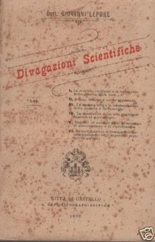 GIOVANNI LEPORE DIVAGAZIONI SCIENTIFICHE ... Città di Castello, Lapi, 1898 Cm. 19, pp. 208, bross. edit.(difetti). Interessante edizione originale antica e d'epoca, gustoso volume dell'autore molisano (?, la presentazione del volume è datata Campobasso, ottobre 1898)relativo alla conoscenza di vari fenomeni scientifici fisici e biologici, con trattazione che comprende capitoli che riguardano i seguenti argomenti: *LE SCARICHE OSCILLANTI E LA TEORIA ELETTROMAGNETICA DELLA LUCE: conduttori, corrente, scariche oscillanti, elettricità,...* *SONNO, LETARGO E MORTE APPARENTE: sonno, sbadiglio, sogni, scoperte del Golgi, teoria del Duval, la fatica, letargo estivo, crisalide degli insetti, i Fakiri e la morte apparente, funzioni del cervello,...* *LA MATERIA VIVA E LA TRASFORMAZIONE DELLA MATERIA E DELL'ENERGIA: cellula, chimica della morte, azione dei batteri, ...* *LA CONTINUITA' DELLA VITA E LA RIPRODUZIONE AL MICROSCOPIO: opinioni del Goette e del Weissmann, ameba, malaria, fecondazione, pulcino dell'uovo, partenogenesi,...* *VEGETALI E ANIMALI UNITI IN SOCIETA' DI ALIMENTAZIONE E RIPRODUZIONE: licheni, alghe, funghi, insetti e fecondazione delle piante, chemotropismo, ...* *LE MODIFICAZIONI DELLA SUPERFIECIE TERRESTRE PRODOTTE DAGLI ORGANISMI VEGETALI E ANIMALI: fango marino, argilla rossa, calcare corallino, terreno vegetale, azione dei lombrici,...* In fondo al volume è anche inserito un catalogo editoriale della nota casa editrice umbra. DI INTERESSE CULTURALE SCIENTIFICO SPECIALISTICO BIBLIOGRAFICO *rara edizione, solo cinque esemplari noti nel sistema bibliotecario nazionale* Buona conservazione generale, segni e difetti d'uso e d'epoca, diffuse fioriture alle copertine ma solo sparse all'interno, difetti e rotture al dorso della brossura, strappo marginale all'ultima pagina di indice, parzialmente ancora a fogli chiusi, eventualmente meritevole di rilegatura.