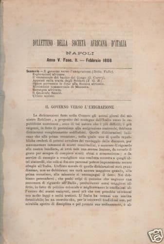 **Bollettino della Società Africana d'Italia** Napoli Anno V, fasc. II, febbraio 1886 Cm. 24,5; pp. (da pag. 29 a pag.52); senza legatura. Interessante antico bollettino periodico edito dalla Società Africana d'Italia, sezione di Napoli, con alcuni scritti relativi a notizie o spedizioni o altri argomenti di cultura africana o di interesse contemporaneo politico. Impossibile dare una esauriente sintesi del contenuto, anche perchè la pubblicazione è ancora a fogli chiusi, ma dal sommario si possono evincere i vari scritti: *Il governo verso l'emigrazione (interessante saggio sulla questione coloniale e sull'emigrazione e sulla condizione degli emigranti italiani)* *Esplorazioni africane* *Il commercio del bacino del Congo* *Appunti sulla tratta degli schiavi* *Opere pervenute in dono alla Società Africana (con interessante lungo elenco di oggetti)* *Movimento commerciale di Massaua* *Rassegna africana* *Il generale Sacchi* *Ultime notizie* Di interesse culturale, specialistico e bibliografico Buona conservazione generale, segni o difetti d'uso o d'epoca, sparse fioriture, senza legatura o copertine, esemplare ancora a fogli chiusi e meritevole di rilegatura. ##### Della stessa serie sono anche disponibili i seguenti fascicoli: *Gennaio 1886; Marzo 1886; Maggio-Giugno 1886 (con ritratto f.t. di G.B. Licata) Luglio Agosto 1886;* *Gennaio-Febbraio 1887 (con carta geografica di Massaua, ripiegata f.t.); Marzo-Aprile 1887; Nov.-Dic. 1887* **(a richiesta eventuali altre informazioni)**