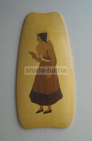 Pannello ligneo intarsiato raffigurante un costume popolare femminile, realizzato negli anni '50. L'opera presenta un piacevole modellato tipico delle arti decorative della metà del Novecento.