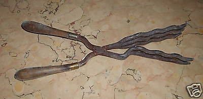 **Pinza arricciacapelli d'epoca** in ferro forgiato e ondulato, utilizzata dagli antichi parrucchieri per i lavori di acconciatura e arricciatura dei capelli lisci, per renderli ondulati e più affascinanti. *Oggetto oggi riutilizzabile ma anche da vetrina e molto decorativo.* Misura cm. 28 circa (lunghezza totale, compresi i manici in legno tornito); databile fine '800 o primo '900 (?)  Da collezione! Buona conservazione generale, segni e difetti d'uso e d'epoca, usuale diffusa ossidazione, così come dalle immagini allegate così come rinvenuta in una vecchia soffitta di famiglia. .