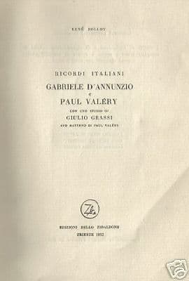 René Dollot Ricordi italiani **Gabriele d'Annunzio** e **Paul Valéry** *Con uno studio su Giulio Grassi avo materno di Paul Valéry* Trieste, Zibaldone, 1952 Cm.17,5; pp.187; bross. edit. (sciupata) **Pregevole edizione originale a tiratura molto limitata e su carta vergellata, con trattazione su** *D'Annunzio dal 1917 al 1926, Incontri con d'Annunzio a Venezia, Confidenze, Viaggio di d'Annunzio nella Champagne, ....Questione di Fiume,....Ultimi incontri al Vittoriale,...* *Paul Valéry in Italia nel 1933* *Ricordi francesi a Trieste, Conferenze e rappresentazioni teatrali francesi a Milano, P. Valéry a Milano, Il centro mediterraneo di Nizza,....* *Giovinezza di Giulio Grassi, Descrizione di Capodistria, Rivoluzione del 1848, Grassi nominato dal Piemonte console a Trieste,...Albero genealogico della famiglia de Lugnani* **Con alcune illustrazioni f.t.** Opera di interesse storico letterario araldico culturale e bibliografico Buona conservazione generale, segni o difetti d'uso e d'epoca, brossura rotta, eventualmente degna di rilegatura. Creato da [Turbo Lister](https://pages.ebay.it/turbo_lister/)