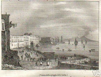 Interessante antica raffigurazione di uno degli angoli più belli della vecchia Napoli, con Veduta della Spiaggia di S. Lucia *animatissima bella veduta, con persone varie, carrozzella, ....il mare popolato di barche e velieri, il Vesuvio fumante,...* Incisione originale litografica, opera di artista di area napoletana, apparsa in un periodico napoletano della metà dell'800 (Poliorama Pittoresco, 1838), ancora sul foglio integro originale, con stampa anche al verso. Misura cm.11,5x16 ca. (immmagine), su foglio originario cm. 30x21 ca.; buona conservazione generale, segni d'uso o d'epoca. **Opera di grande interesse collezionistico,** artistico storico geografico e bibliografico, *ma anche di bell'effetto decorativo, degna di essere montata sotto passpartout ed incorniciata.*